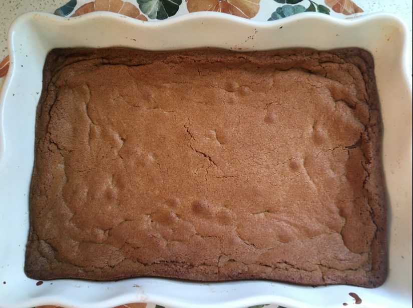 Who, after a nice long hike or outdoor adventure, ever asks for a kale salad? There may be a few folks who will, but what I usually hear are requests for a nice double double hamburger from In-N-Out or some sweet and delicious carbs. So here’s an easy recipe for an oft-requested dessert: blondies. Blondies tend to be described as ‘blond brownies,’ or brownies without the cocoa. I maintain that they’re a dessert on their own merit, with a chewiness that is somewhere between a brownie and a soft cookie. The brown sugar and butter give blondies their flavor, enhanced by whatever mix-ins you decide to add. I typically add butterscotch chips or Rolo candies, but other chocolate candies, nuts, or chocolate chips work well. So without further ado, here is my favorite blondie recipe.