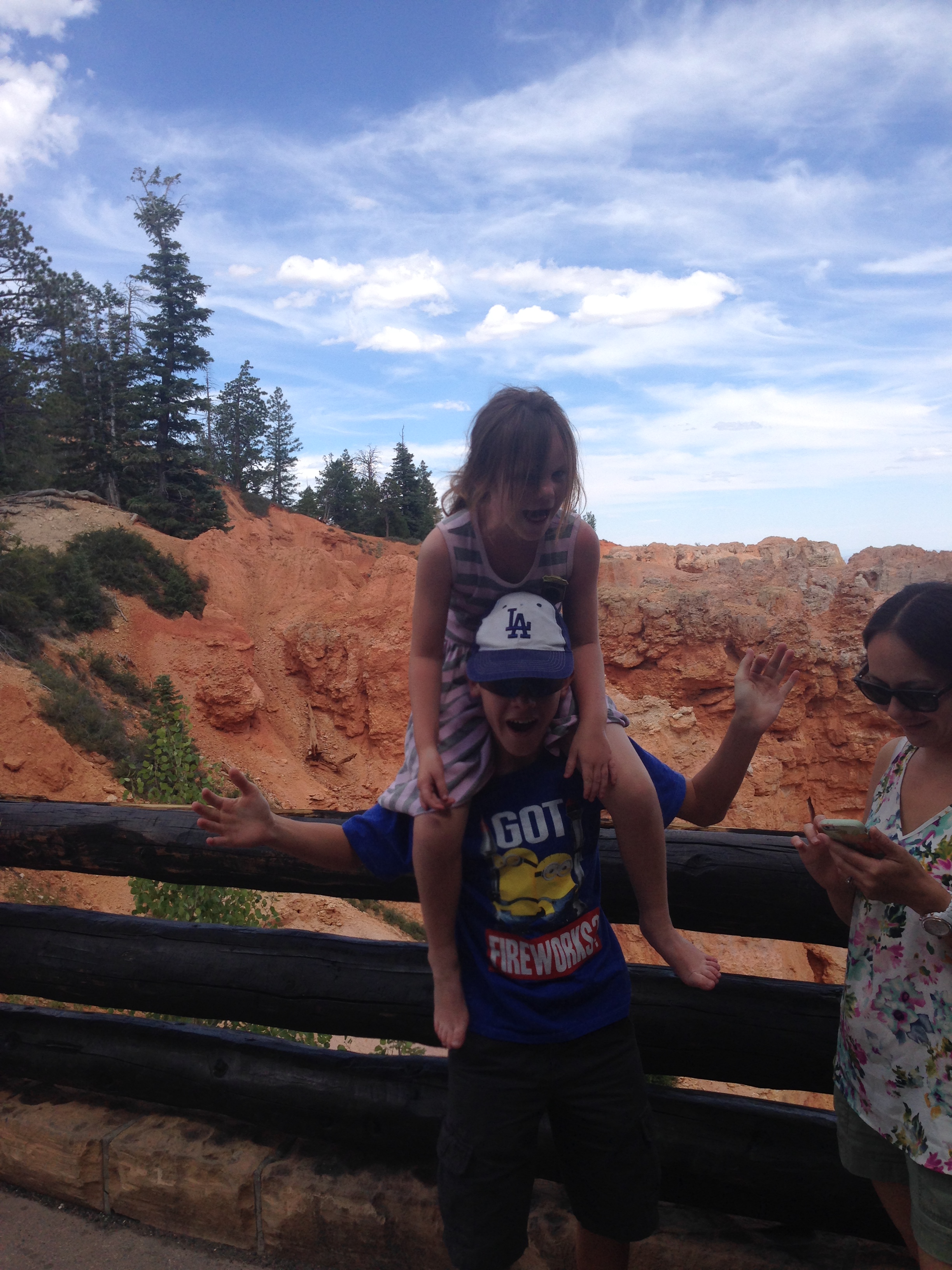 Navajo Trail- 1.3 miles- We somehow ended on this trail, and found Thor’s Hammer. The husband of course took a cheesy photo with it, and it was fitting too, as he was wearing his superhero dad shirt. The loop begins at Sunset Point and takes you through a slot canyon with Douglas fir trees growing high within the canyon.