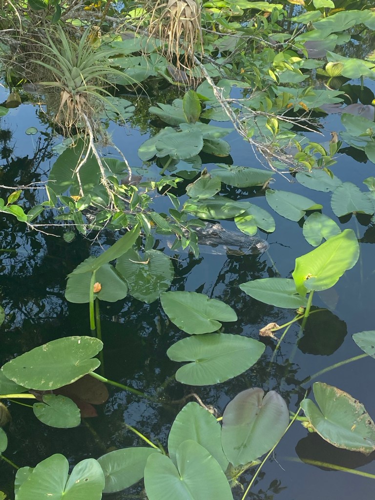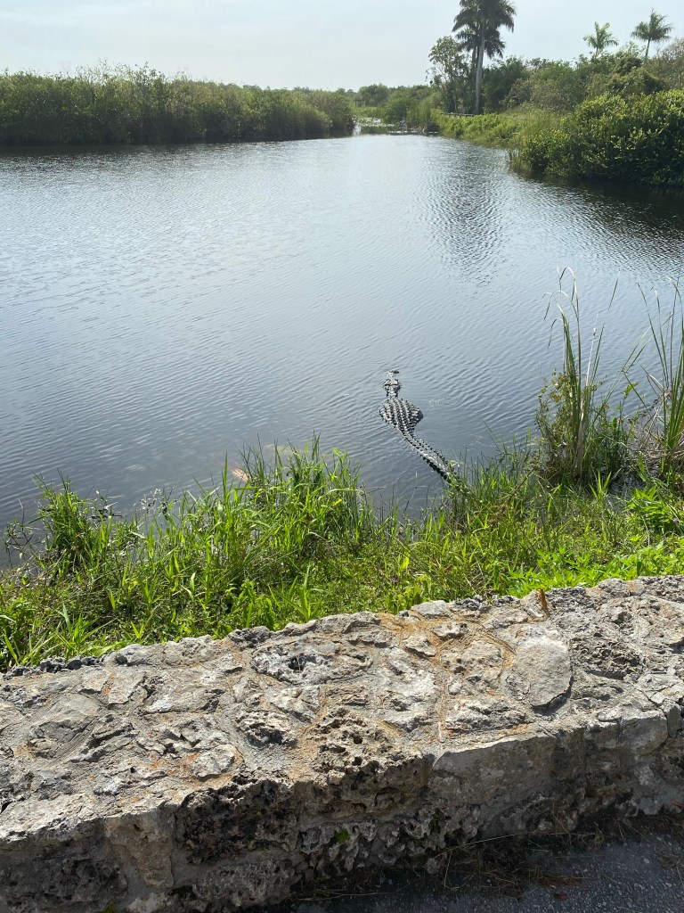 The Anhinga Trail was what I had always imagined the Everglades to be. The trail consisted of a wooden boardwalk meandering over the watery Taylor Slough. The Taylor Slough is a shallow wetland that provides drainage for freshwater to the Florida Bay. Here we saw a diverse aquatic ecosystem at work. The surface of the slough was covered by bright green water lilies, with cypress trees forming islands in the water. These gave cover to some of the animals we were able to spot, including an alligator hiding among the cypress roots. We also saw an abundance of fish swimming in the water, and the trail was littered with swarms of lubber grasshoppers, one of the world’s largest species of grasshopper. As we completed the Anhinga Trail and walked back to hit the short Gumbo Limbo loop trail, Emily spotted something large and round. As we got closer, we were surprised to find that it was a large alligator slinking back into the water after sunning itself. Even with a few people watching his movements, he was unbothered by our presence, and paid no mind to us. We kept a safe distance and enjoyed the sight of nature at work, taking only photos.