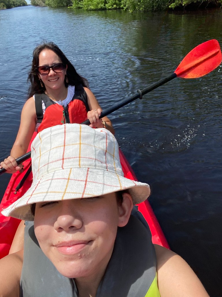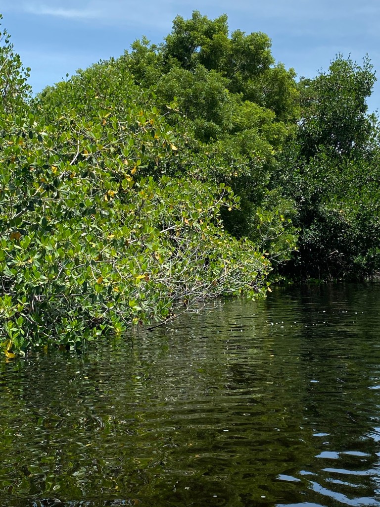 Well, that idea was a bit of a bust at first. We quickly discovered that while in the past we had both gone canoeing in larger groups, it was much harder to control a canoe with just two people who admittedly have zero upper body strength. So after watching us struggle to leave the dock, and possibly laughing with us as we laughed at ourselves, the guy brought us a kayak, which proved to be much easier to handle. We had a great time exploring the estuarine environment while floating on the water and working together to paddle the kayak. After about 45 minutes or so, we decided to turn back, giving up on the hope of finding crocodiles or manatees. As we floated under the bridge and toward the dock, I spotted a floating snout. We had indeed spotted a small crocodile at the surface of the water within about three feet of us. In my excitement, I ceased rowing, and we quickly headed straight into a mangrove tree. At that point the guy who had helped us with our kayak pointed out the much larger crocodile, one that was at least a six-footer, that we possibly almost ran into. It was a sight to behold, as it glided gracefully through the water and sank from view. We didn’t get to see any manatees, but we did see a nice grouping of bright blue needlefish back at the dock, as well as a number of birds.