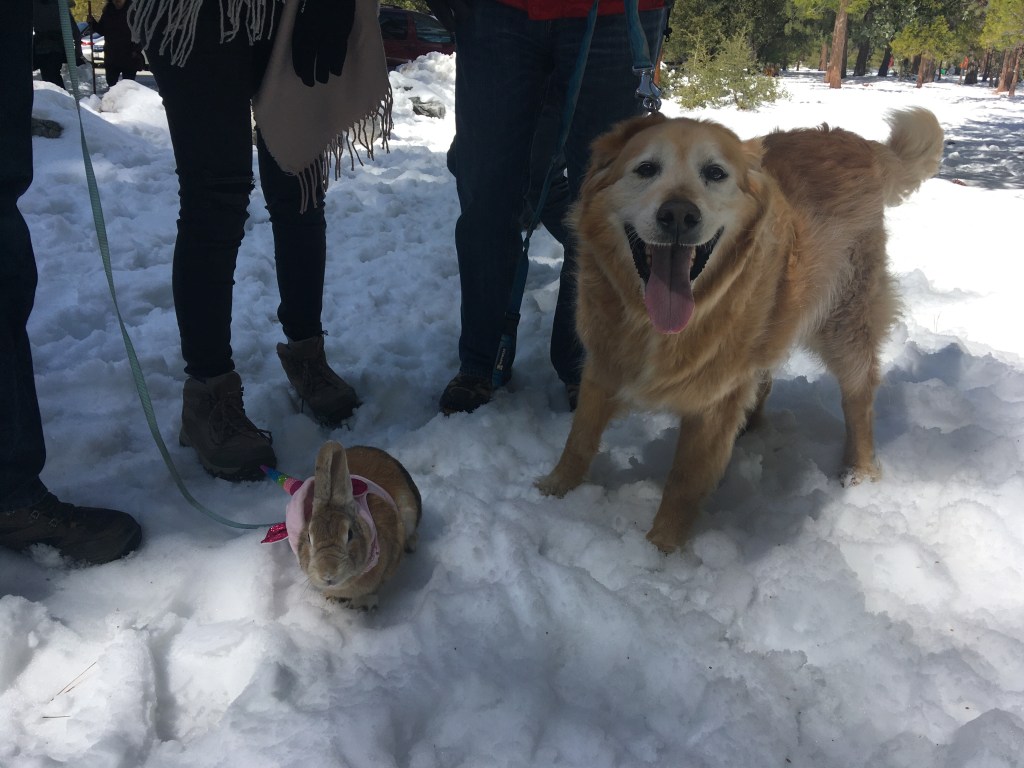 It was a fun afternoon of snow play. With a rather short drive from the San Gabriel valley, and reasonable traffic, Crystal Lake Recreation Area was the perfect site for a snow day with the pets. Between our fluffy dog and bunny, we had many happy tails.