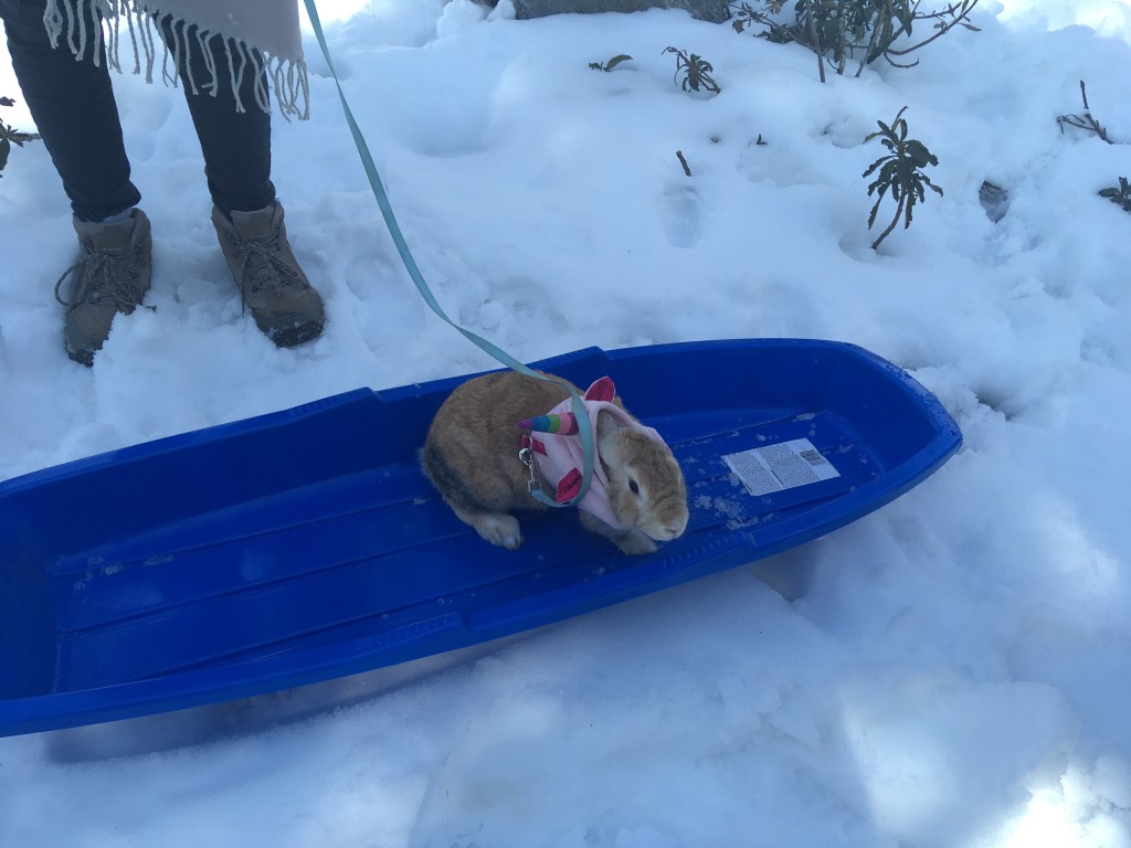 We hung out around the campgrounds, which had small slopes enough for sledding. Owen had a great time sniffing around and bounding happily in the snow. Penny looked a sweet little snow bunny in her unicorn harness as she hopped around. We kept a close eye on her to make sure that she didn’t get too cold, as we’ve read that hypothermia can be dangerous for a domesticated rabbit.