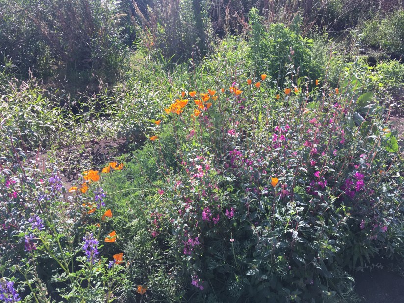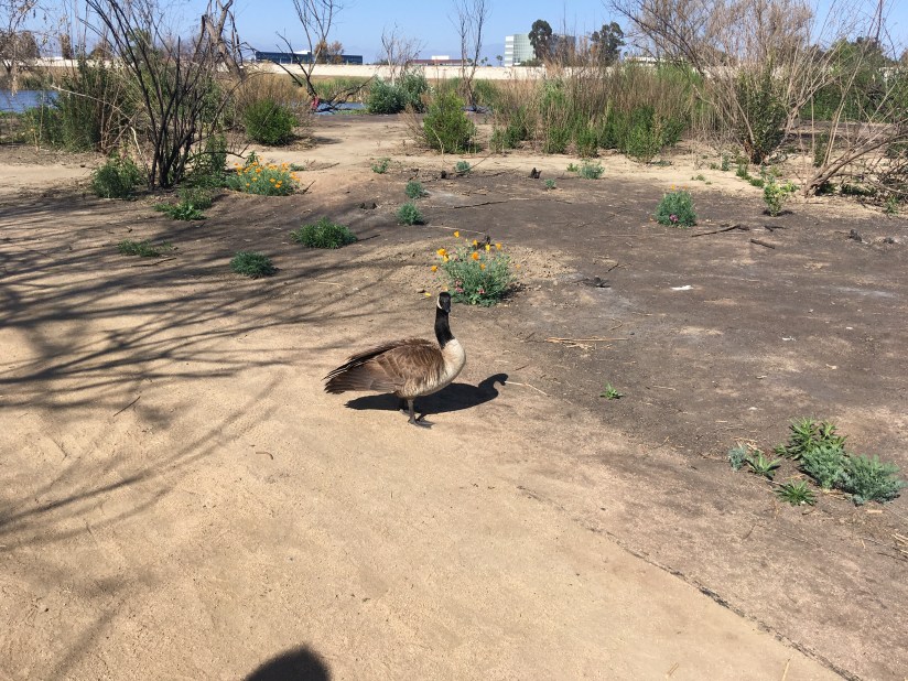 Depending on the season, you’ll find different varieties of birds. Year-round, you’ll see waterfowl swimming in the pond, which was formed from borrow pits and filled with water from the nearby Tillman Water Reclamation Plant. Haskell Creek flows next to the pond on its route to the Los Angeles River. There are major efforts for vegetative restoration, and these seem to be paying off. On our visit last week, we saw poppies, roses, and other beautiful flowers in bloom. And of course, there were many other birds.
