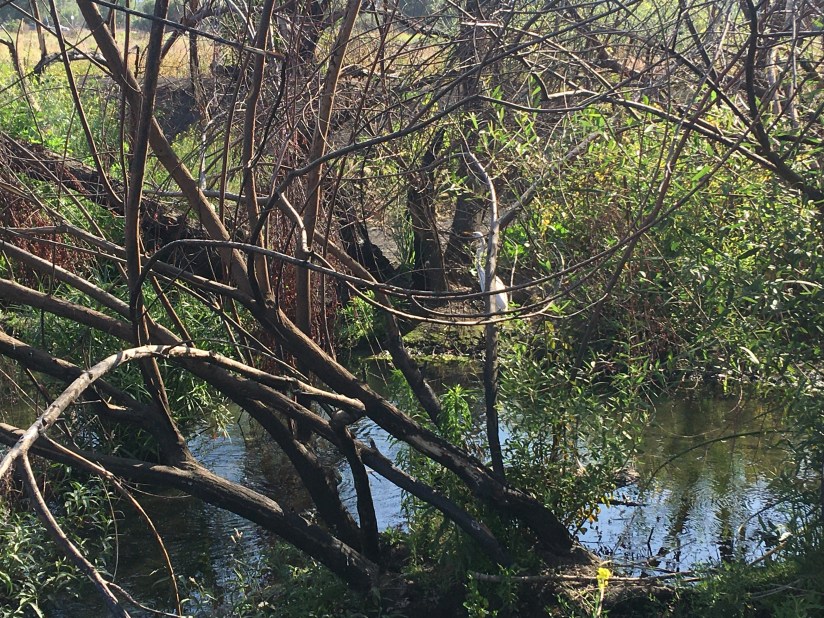 The kids were excited to do a little bit of birdwatching. As we started the trail from our parking spot on Woodley Avenue, we spotted a red-tailed hawk flying low just above us. As we headed to a bench by the side of the pond to eat our afternoon snacks, we were greeted by two Canadian geese wandering around by the pond. They scared us away because one looked like it had an eye on Emily’s sandwich. We found another spot by the pond and watched the many ducks floating on the water, as well as a few snowy egrets. Cormorants and what looked to possibly be a pelican was on the far side of the pond.