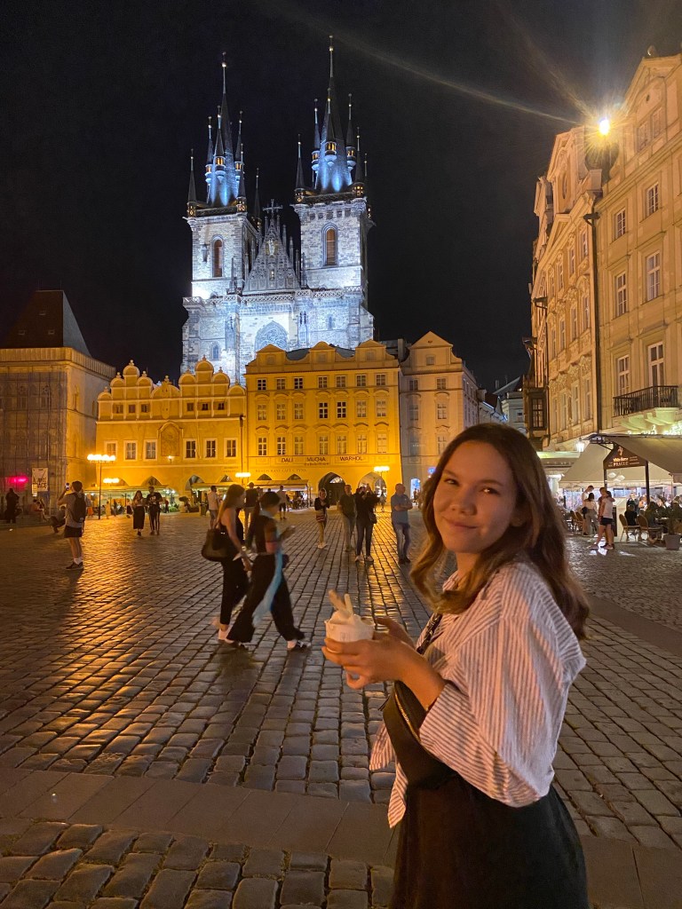After arriving at the flat, we opted for a trek to get gelato and our trusty American travel go-to, McDonalds. Even a simple walk for a simple dinner took us to some historic sites. We found ourselves in Old Town Square in Praha 1. Old Town Square, as the name suggests, is considered to be the oldest part of the city of Prague. From the 12th century, it was a trading center connecting the European trade routes. Its location along the Vltava River gave easy access to trade. Today, the historic buildings have been well-preserved. We walked by the Old Town Hall with the 15th century Astronomical Tower, the world’s oldest working astronomical clock. The historic St. Nicholas Church and the Church of Our Lady Before Tyn also stand in Old Town Square. For those who know their Protestant Reformation, there is a statue of Jan Hus, the Bohemian preacher and reformer from Prague, who was burned at the stake for his views.