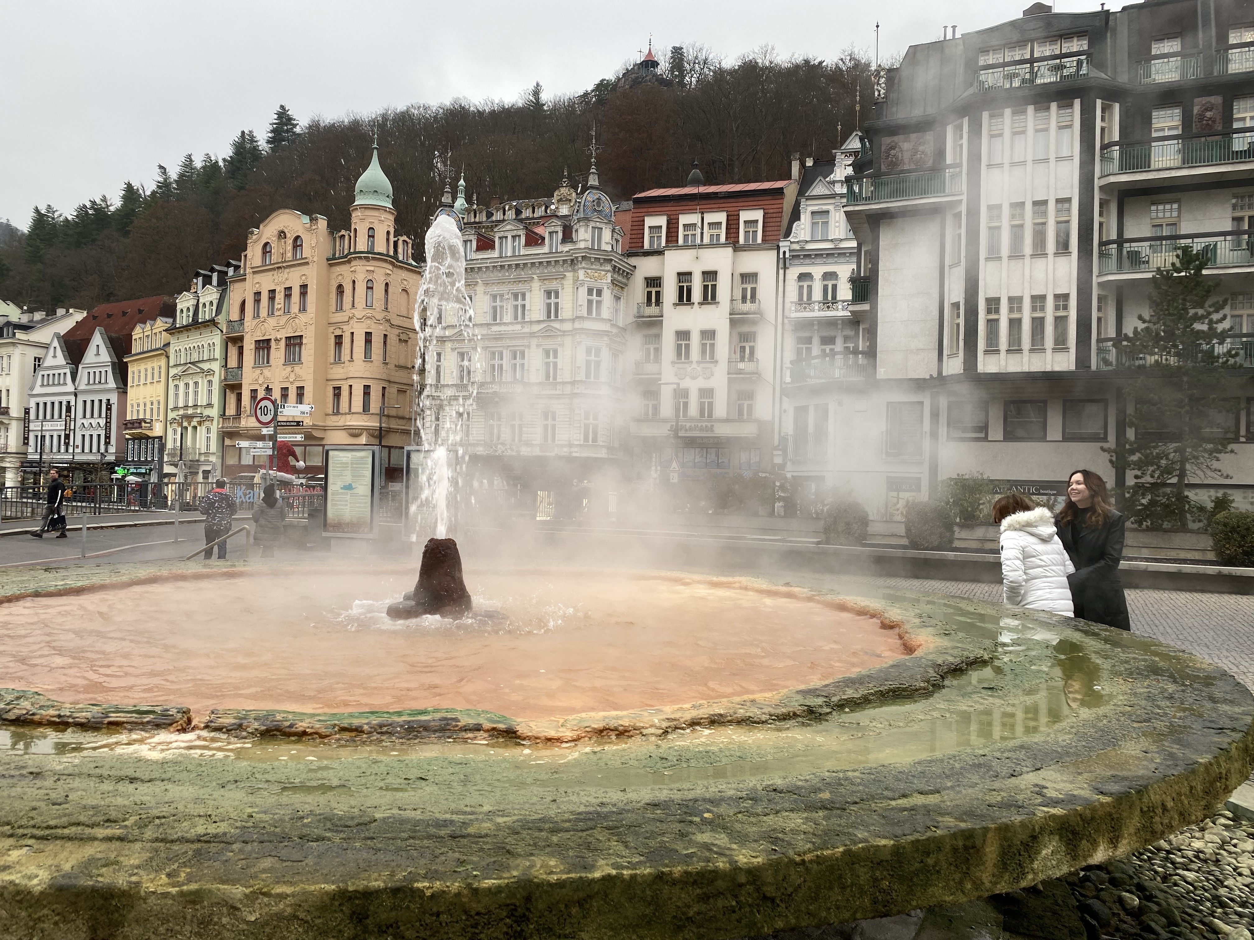 We continued our trek up the main street and visited the Swiss-styled Market Colonnade as well as the modern build Hot Spring Colonnade. I did not realize that the glass and reinforced concrete structure was actually a colonnade housing a hot spring. Inside the pavilion is a geyser that has the ability to shoot hot water up to 12 meters high. The structures are located right by the Teplá River, and there is a large fountain with hot spring water feeding it that Sami expressed wanting to splash in. Up until she realized that she would have to get out into the freezing cold of the Czech winter air.