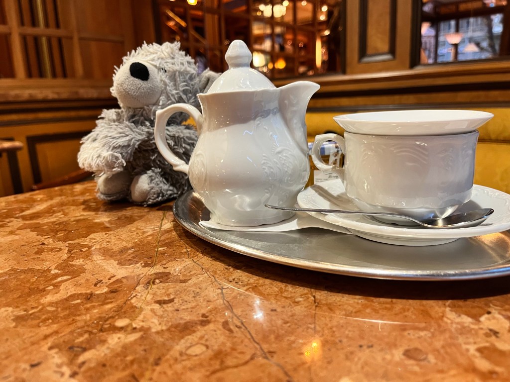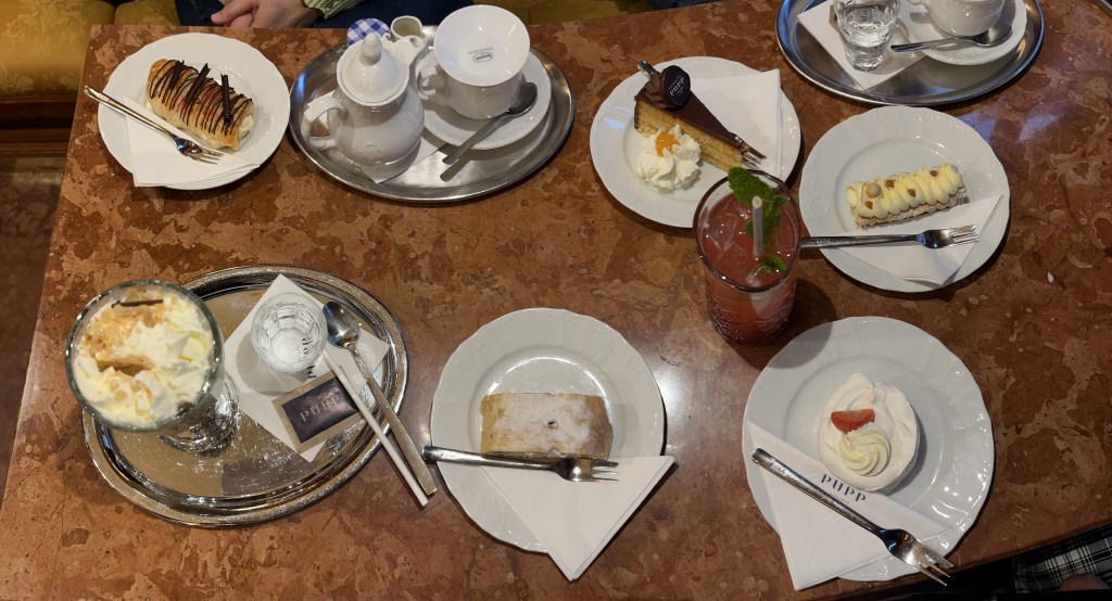 Our goal though was dessert, and there was a lovely selection of desserts and coffees at the Cafe Pupp. We each selected a dessert and drink and just enjoyed the time together in an opulent setting. The girls teased that they were disappointed to find that with a name like ‘Pupp,’ there were no dogs around. We did have Chris the Puppy, and he sufficed on this trip. The desserts were delicious, and it was nice to be able to sit inside and out of the cold.