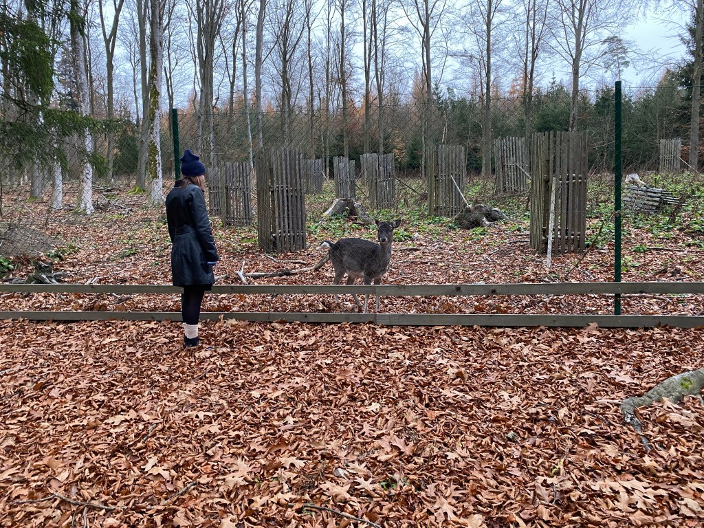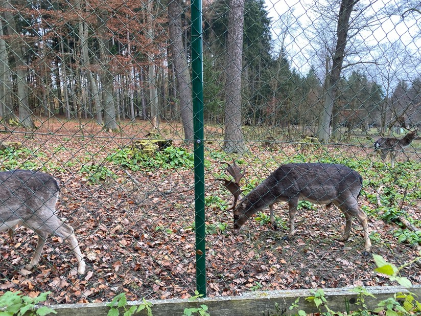After enjoying the views for a while, we started to get cold, and headed back down the many stairs. We walked around Diana, which has a restaurant, petting zoo, butterfly house, as well as hiking trails. We took the trail to the Svatý Linhart Preserve, a nature park encompassing about 70 acres, with many deer and some wild pigs living within the preserve. After walking through some peaceful moss-covered woods, we found the bridges from which we could watch the animals grazing in the meadows. Emily also found some nice deer that she fed through the fences, while Sami had fun exploring from the observation bridges.