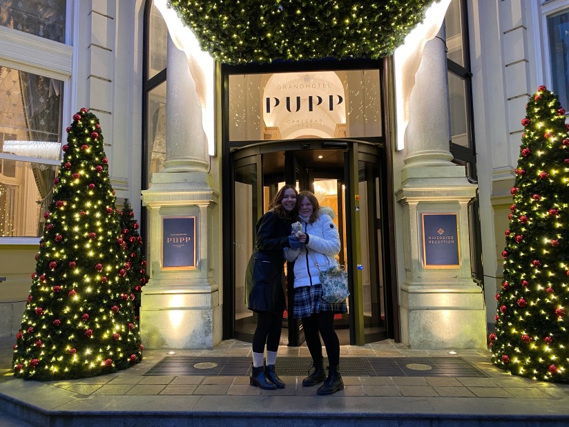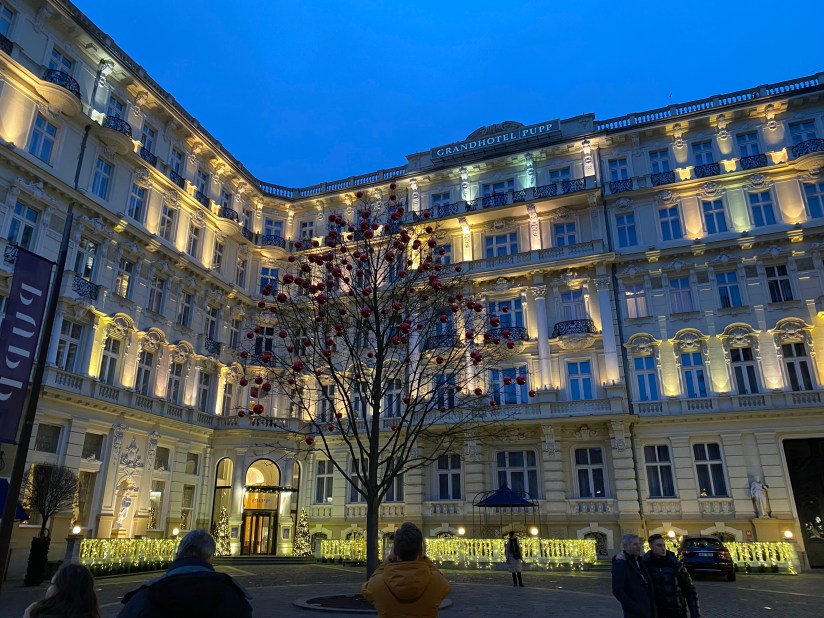 After heading back down the hill via the funicular, we headed back to the Grandhotel Pupp, which the girls were hoping to check out for dessert. As it was Emily’s eighteenth birthday, we felt that some fancy desserts and drinks would be an appropriate way to celebrate. The Grandhotel Pupp is an elegant and historic luxury hotel dating back to 1701, when it was Saxony Hall. Over the course of the 18th century, the Pupp family acquired the land and buildings surrounding the hall, and were eventually able to purchase the hall itself at the end of the 19th century. The current buildings were constructed in the early 1900s, and they are indeed grand. Fun fact, the hotel was transformed into the ‘Hotel Spendide’ for the James Bond film, Casino Royale.