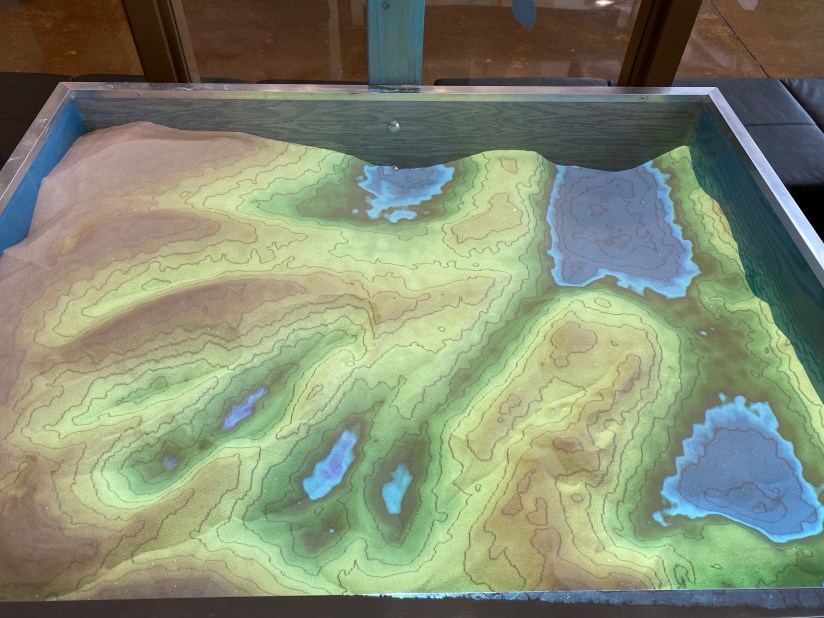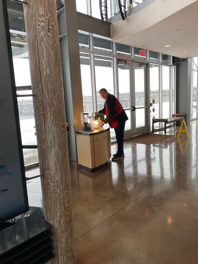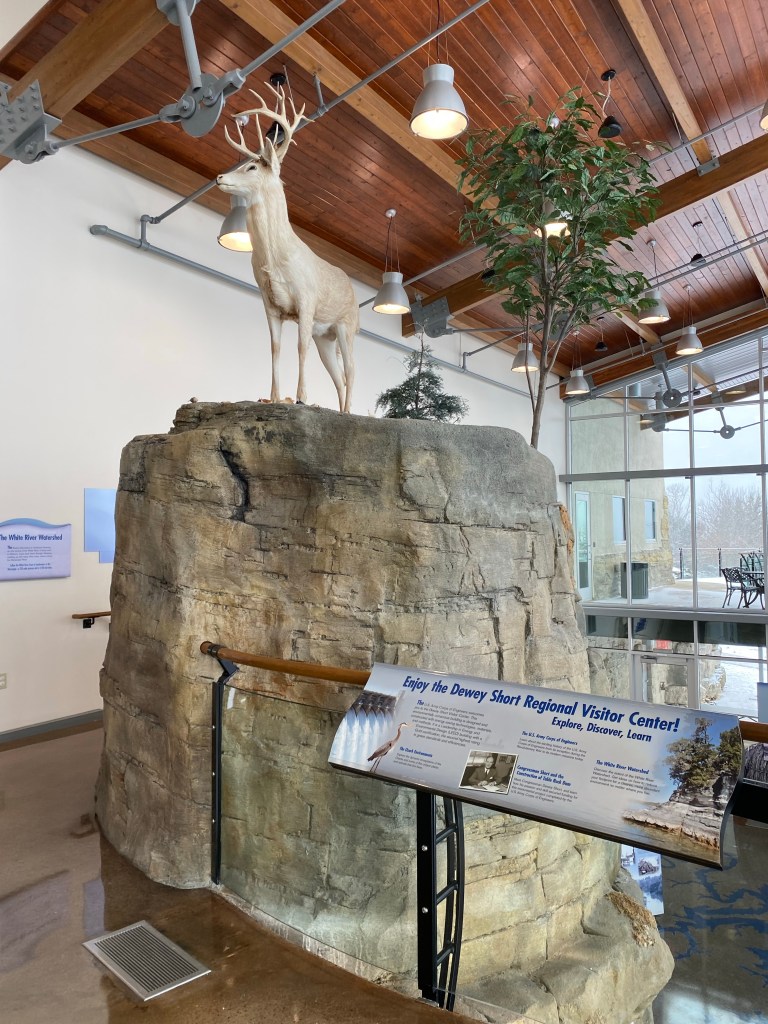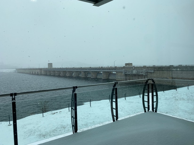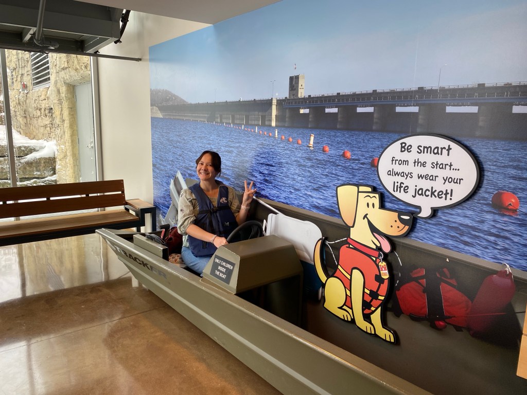 In addition to providing the power needed for electricity generation, Table Rock provides endless opportunity for outdoor recreation. Table Rock Lake boasts over 800 miles of shoreline across both Missouri and Arkansas. Table Rock State Park has many options for fun both in and out of the water. Boating, paddleboarding, fishing, and kayaking are just some of the options one has to enjoy Table Rock in the water. There are also a number of trails for hiking and mountain biking for those who are more inclined to stay on terra firma. Unfortunately for us, after the 75-degree temps the days before, the temperatures fell and snow was falling. Our visit to Table Rock Dam was confined to the Visitor Center and a drive over the dam itself. That said, the ranger on duty was great. Ranger Ryan was very knowledgeable, and not just about Table Rock. Turns out he had been out in California for a while, and so he was familiar with some of the same spots we are. He even gave us an Army Corps Table Rock Dam Junior Ranger Badge.