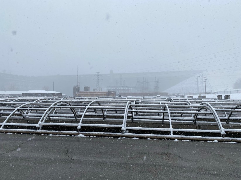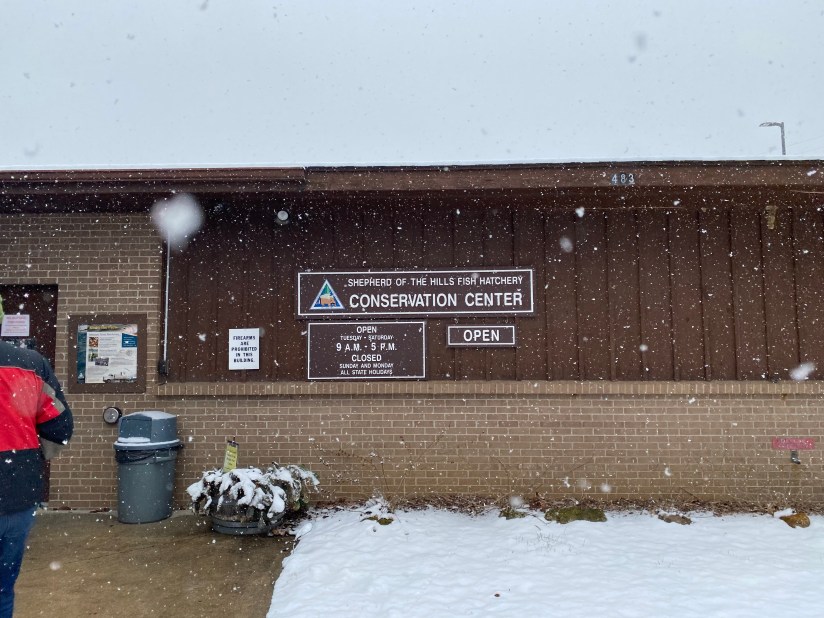 After watching an eight-minute video on how the trout are spawned and raised, we dropped a few quarters in the vending machines to purchase handfuls of fish food. Though the temperatures outside were literally freezing (the snow was falling rapidly at that point in the day), we took the opportunity to feed the fishies.