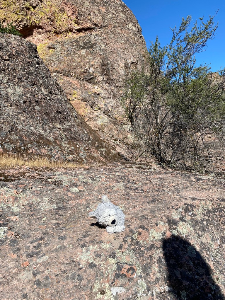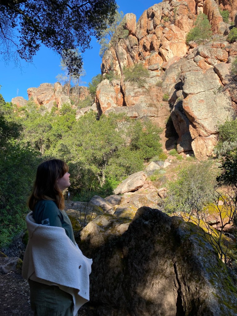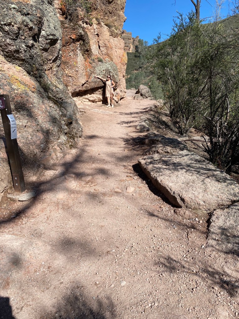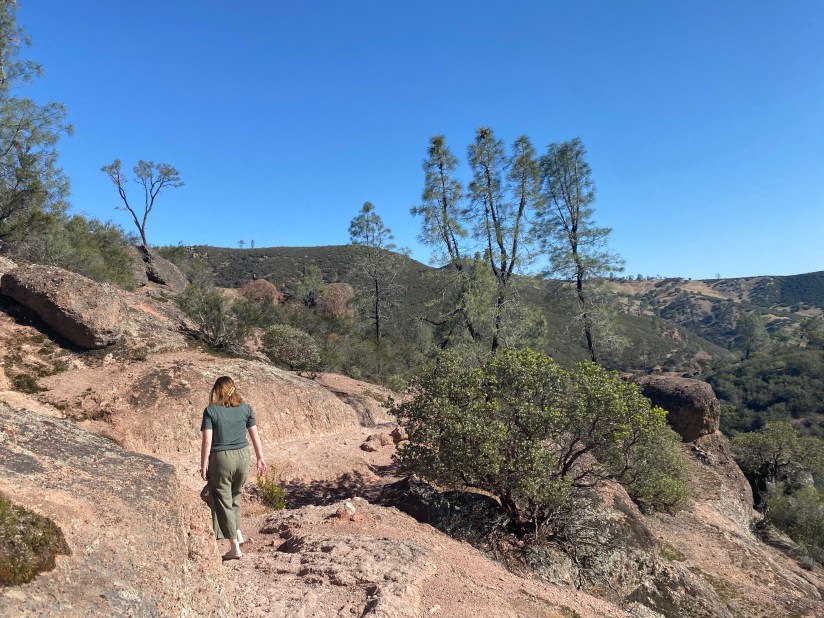 After talking to a few friendly hikers and a snack break, we took the Rim Trail up to loop back to the car. This was an easy-moderate 1.2-mile hike with about a 275 foot elevation gain. While the temperatures stayed mild, the sun was shining and the trail is exposed. I made sure to have Sami reapply sunscreen to prevent an unwelcome sunburn. Even with a couple stops, we arrived back at the van relatively quickly. There we finished our junior ranger books with the intent of commemorating Junior Ranger Day by getting our badges at the Bear Gulch Nature Center. Unfortunately for us, the nature center was closed on account of no electricity thanks to PG&E’s scheduled maintenance. We headed back to the visitor center to get our badges, but we found that they were out of power as well and as they were now a bookstore, they did not handle the junior ranger program. However, we could get our badges at the entrance kiosk, and that is what we did on our way out of the park- the east side anyway. Because the day was still young, we were headed to the West Pinnacles, an hour’s drive away.