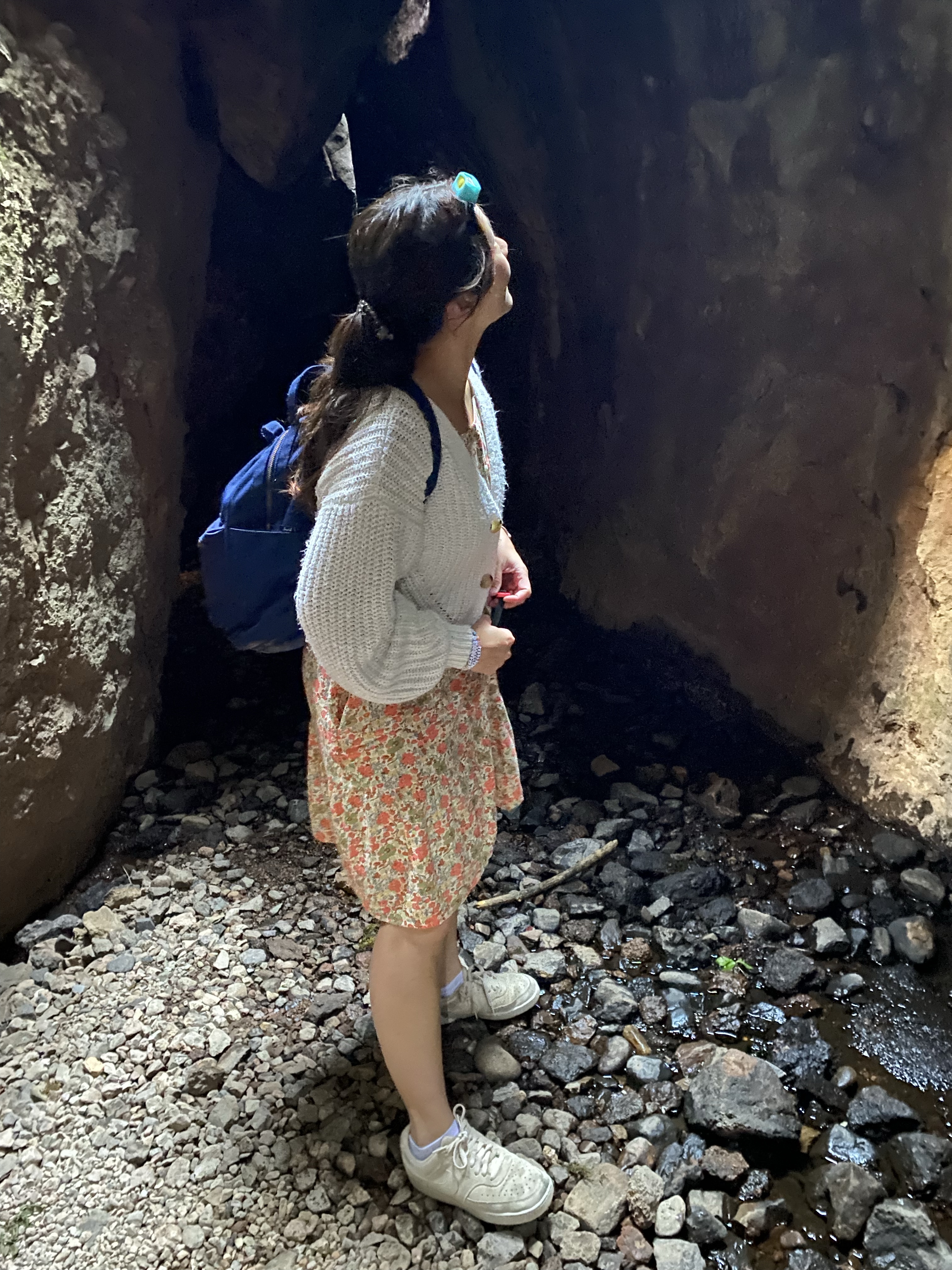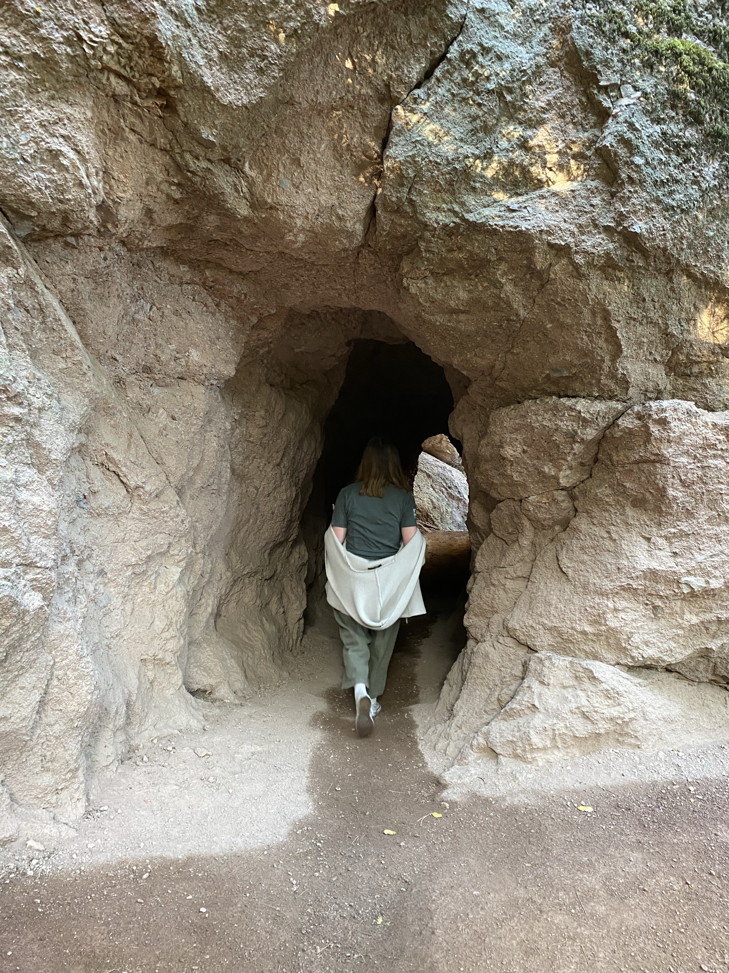 We followed the signs to the Moses Spring Trail to Bear Gulch Caves. Our plan was to hike the caves and the reservoir and then loop back to the parking area. The morning was cool, and while we dressed in layers, I opted to wear a dress based on what the highs would be later in the day. I did feel cold at the start of the hike, but that changed with the excursion and as the morning warmed up. The hike to the caves was rather easy. It was a half mile along the Moses Spring Trail to the Bear Gulch Cave Trail. We arrived at the caves entrance, and after donning our headlamps and taking a few photos, we entered the caves.