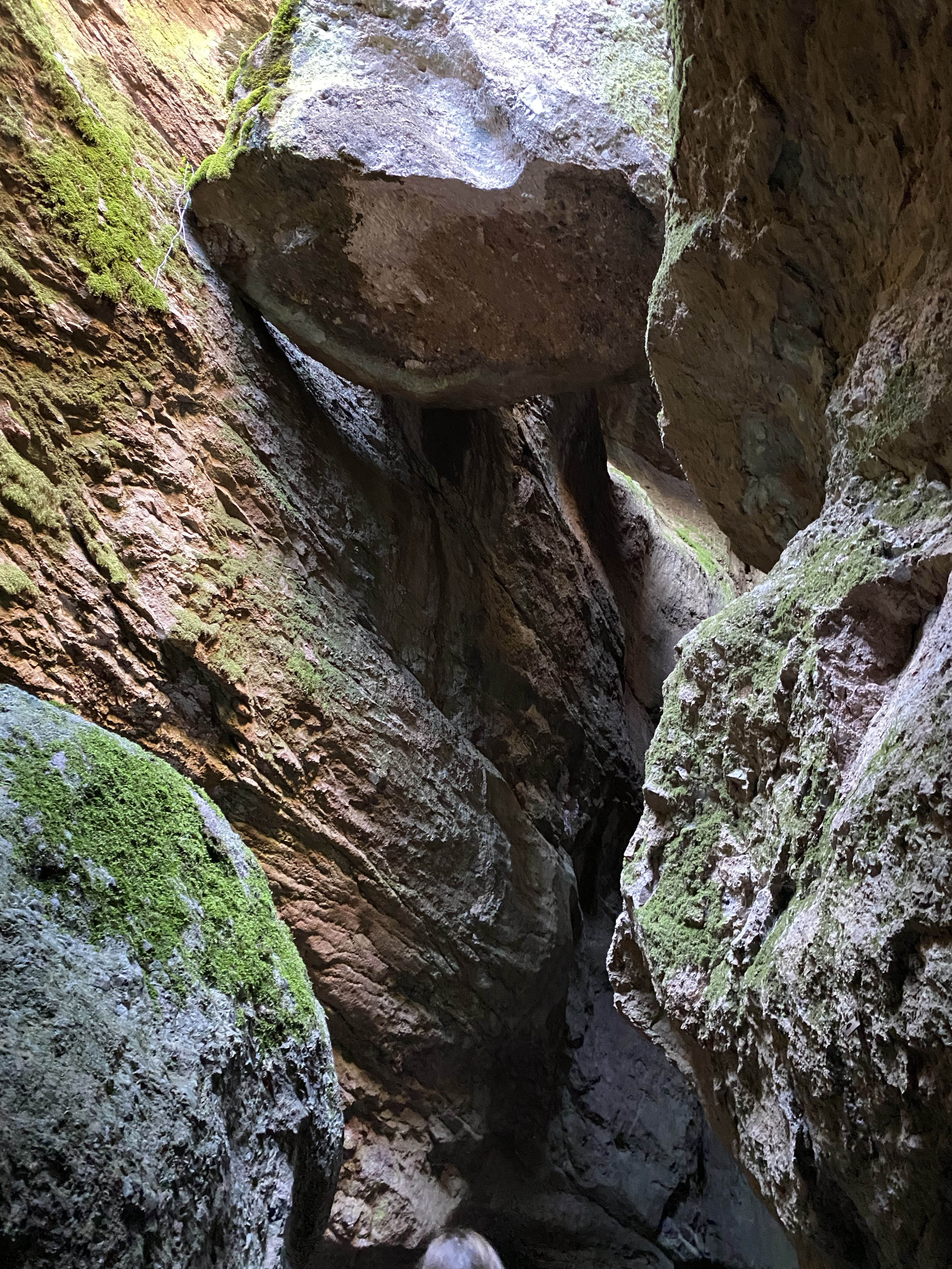 Pinnacles spans across both Monterey and San Benito Counties in Central California. It is thought by geologists that a long time ago, in an area that is not too far away, the Pinnacles-Neenach volcanoes formed the rocks that make up modern day Pinnacles. Over time, the action of the infamous San Andreas Fault split the volcanic field and carried the Pinnacles north from their origin in Southern California to its present location over 200 miles away. The faulting also is likely responsible for the talus caves that are a main attraction to Pinnacles. Unlike the caves in Carlsbad Caverns that were formed by chemical weathering when acidic water dissolved limestone in the area of the Guadalupe Mountains with typical cave features like stalactites and stalagmites, talus caves are formed when boulders of just the right size pile up on each other in narrow canyons, leaving openings that are large enough to be explored. And explore them we did.