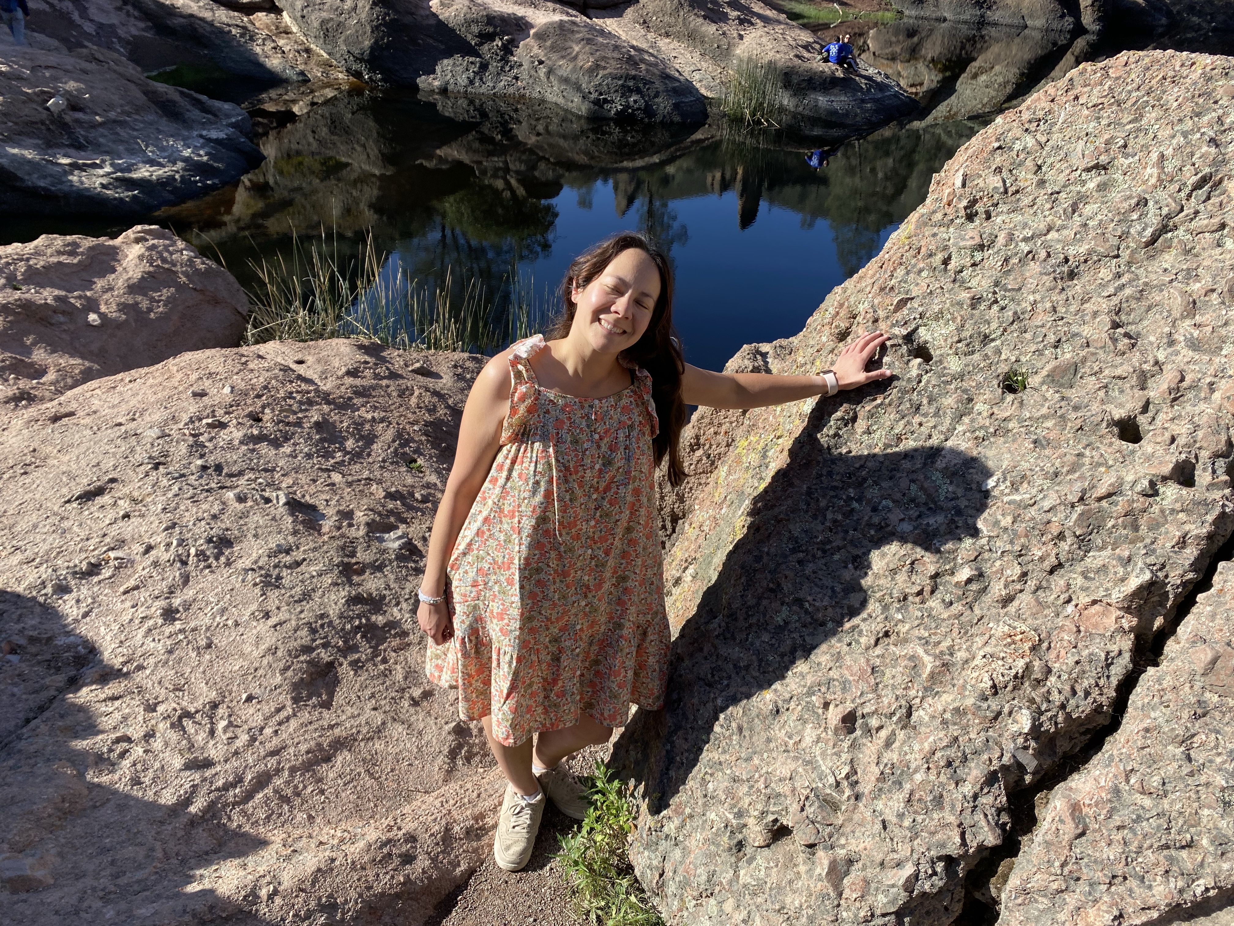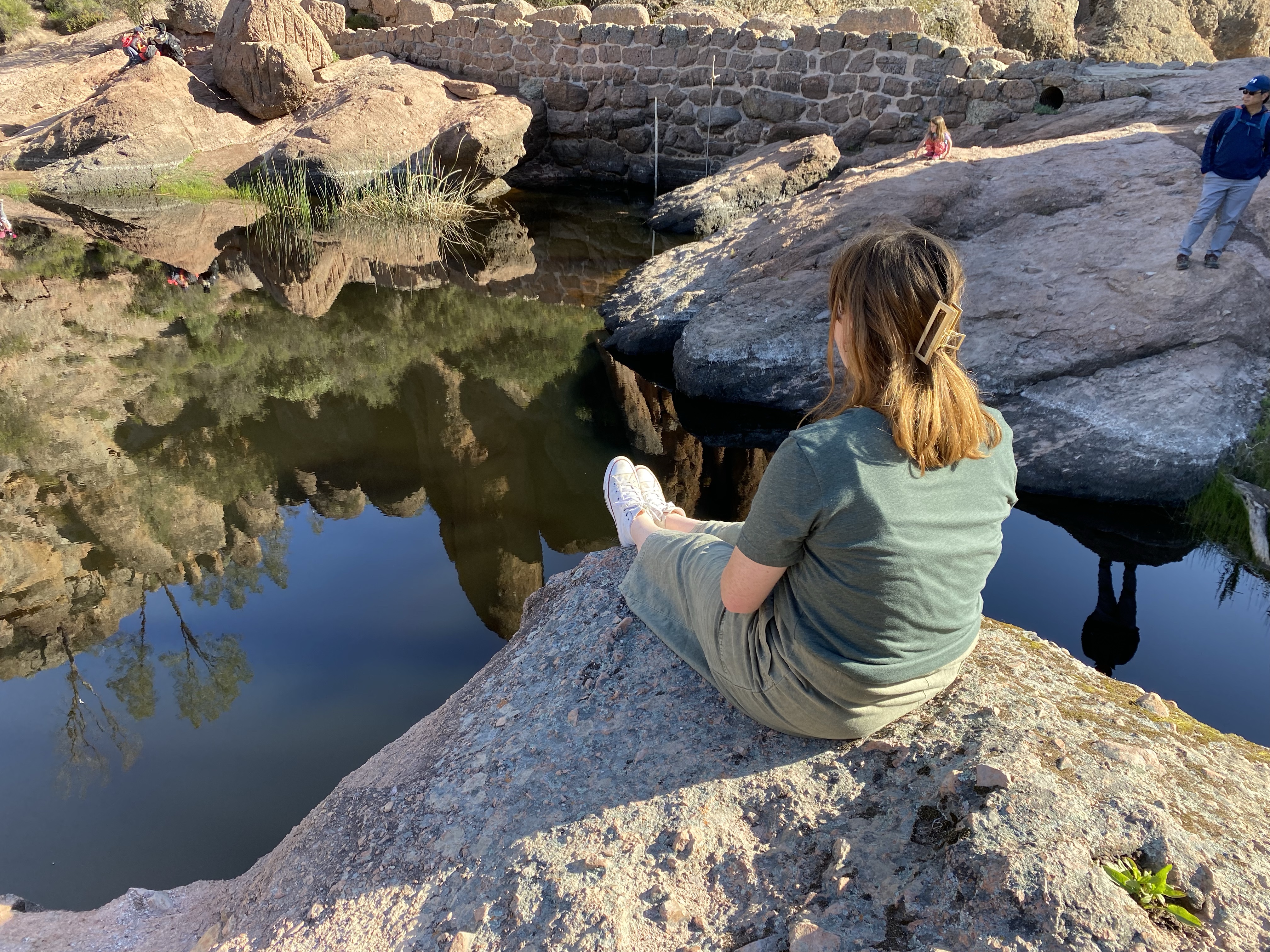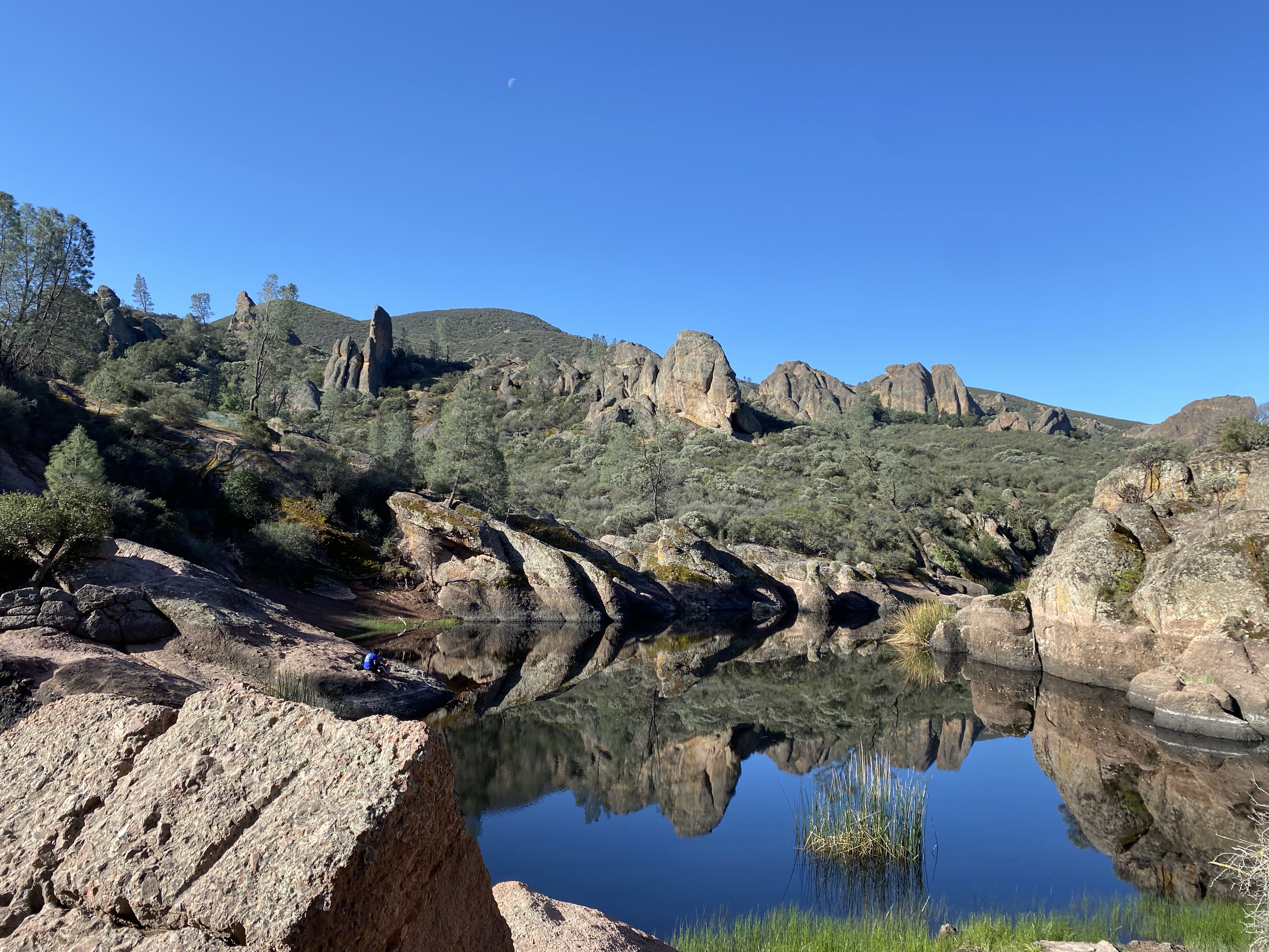 We exited the caves and headed to the reservoir. This was a short hike, under a quarter-mile or so that took us to the mirrored pool that is the Bear Gulch Reservoir. The reservoir was created in the 1930s by the Civilian Conservation Corps to control flooding. Today it is an important habitat for the California red-legged frog, a threatened species under the federal Endangered Species Act. The still water reflected the blue morning skies perfectly and looked so pretty in contrast to the bouldery peaks surrounding it. With plenty of space, it was a great spot to stop for a snack and take more photos.