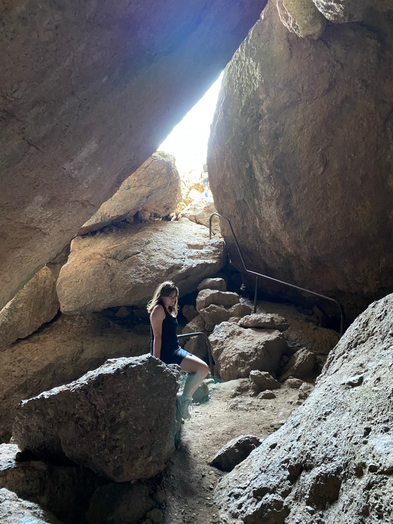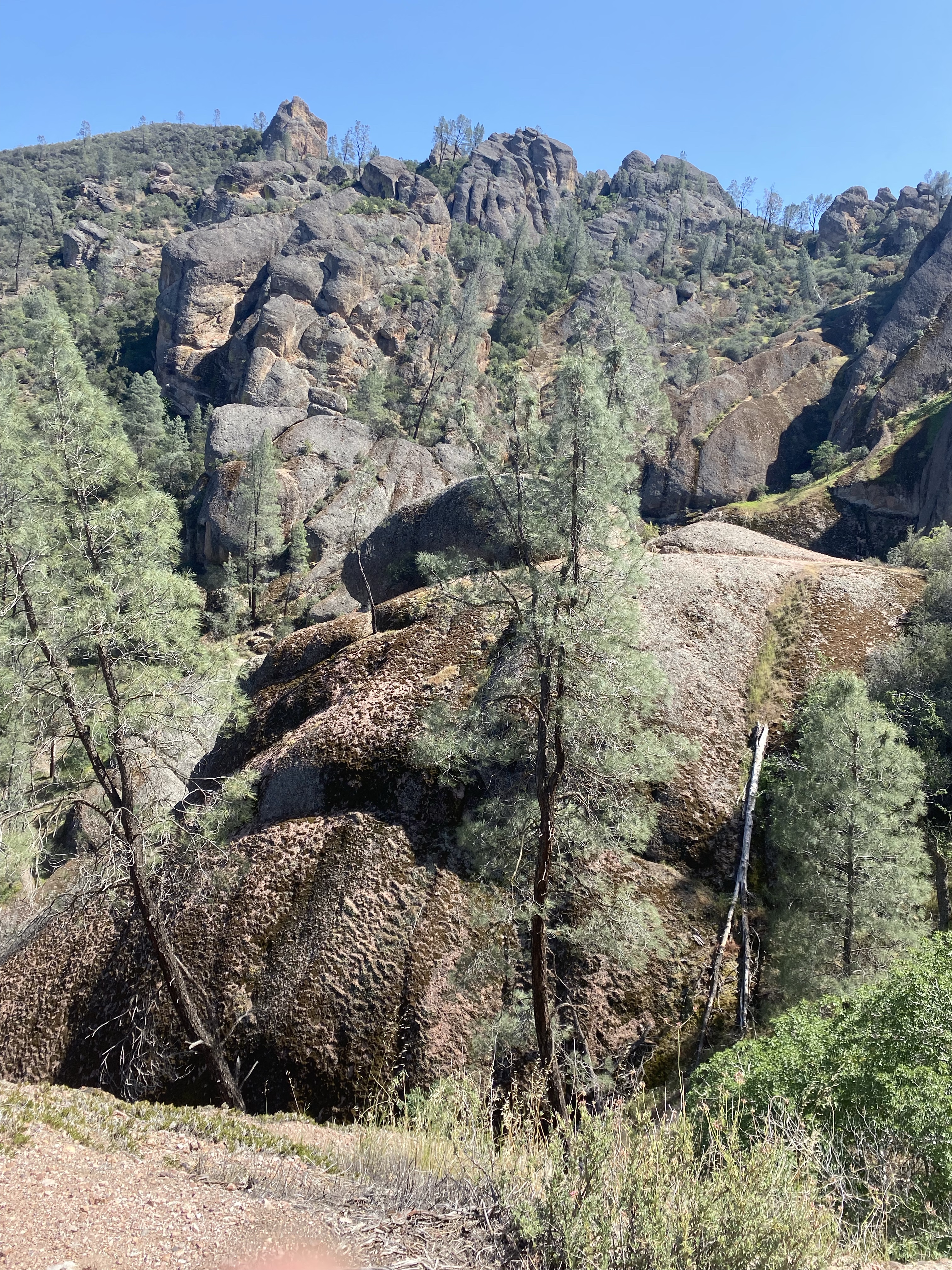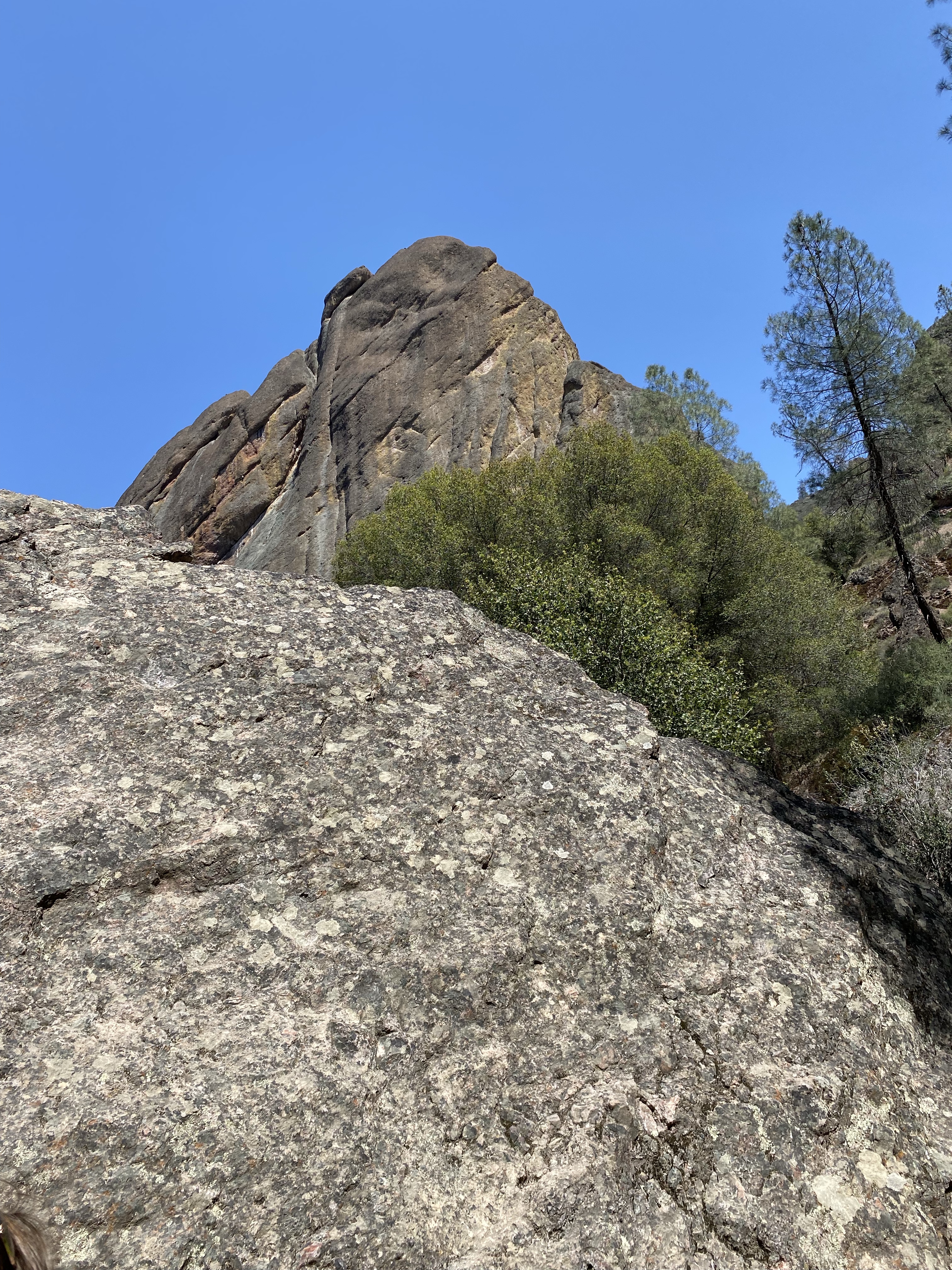 After my difficulty with the eastern portion of the Balconies Caves, the trail was no problem. The trail was mostly flat, with just a bit of an incline. According to my Strava, the total mileage for the hike was 2.60 miles with a 380 feet of elevation gain. The views though were impressive. The pinnacles were so pretty in the midafternoon sun, and we even saw a very large bird that we think was likely the rare California condor. But closer to us was a group of turkey vultures that look a lot like the condor, but are significantly smaller. Both looked to be looking for something that was probably in the canyon below.