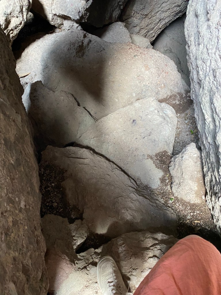 We made it through the first portion of the caves without incident. While there were some tight squeezes and points when we had to duck under boulders reminiscent of Indiana Jones, it was manageable. Soon enough we reached the ‘staircase’ which were more like boulders that had a rail.