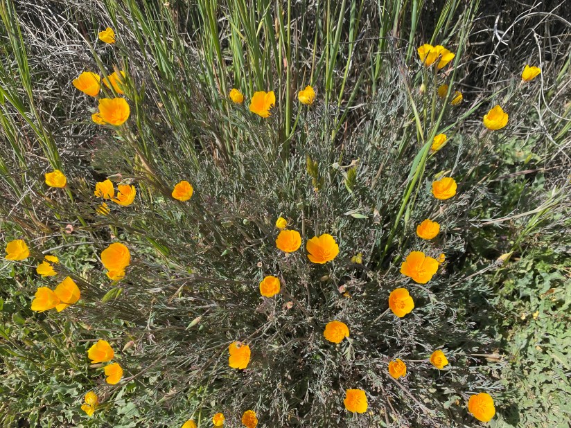 This was a beautiful hike. We saw a ton of wildflowers at the West Pinnacles. While there were only a few bright purple lupines still in bloom along the trail, there were a number of lovely, golden-orange California poppies starting from the trailhead. Carpets of little yellow flowers covered the meadows, and with the bright blue skies above with the green of the trees and tans of the pinnacles, it was a perfectly picturesque hike. We did, of course, stop to take a few photos before heading to the caves.