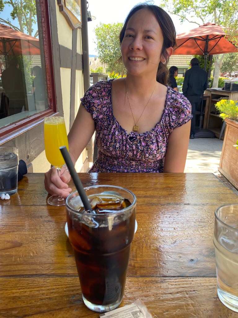 We walked over to the popular cafe. There wasn’t much of a wait as we were arriving just after lunch time, but it was still rather busy. The host said that their business had been steady with extended spring breakers coming in. That said, the service was still prompt, and our food and drink orders were taken pretty quickly. While waiting for our meal, Sami enjoyed her iced coffee while I sipped on a mimosa. It was a perfect day for dining al fresco; the weather was sunny and mild as many days along the central coast tend to be.