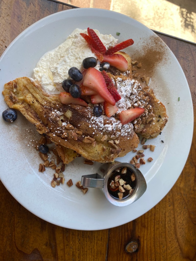 The food was delicious. We split a Cali benedict with the bacon on the side and the bourbon vanilla French toast. Both were great. The French toast was served with a pecan bourbon syrup, pecans, berries, and a mountain of whipped cream. The Cali Benedict had smashed avocado, poached eggs, caramelized onion, tomato, green onions, Sriracha hollandaise on a brioche-type biscuit. It came with a side of breakfast potatoes and those I would highly recommend. The meal was on the higher end of what I typically spend, but brunch tends to be a more expensive meal and we were finishing up vacation anyway. I thought it would be nice to have a special treat before heading back to home and real life.