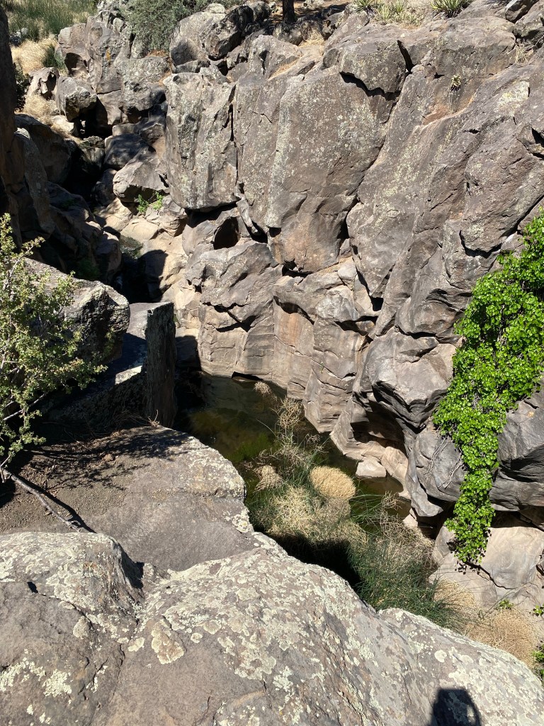 We visited the park on a Thursday. After driving behind the Purina dog food factory, and parking not far from the nearby Wildcat Hill Wastewater Treatment Plant, I was ready for some not stinky fresh air. After checking out the map, we started counter-clockwise on the Tom Moody Trail. We passed the water treatment plant and the pond, which had around it number of birds. Indeed, the area is a designated Watchable Wildlife Site and Audubon Bird Sanctuary. Just ahead of us was a school group on the trail. We met up with the group at the small waterfall in the basalt canyon less than a half-mile from the start of the trail; turns out they were a summer school program. The easy trail has a number of features that makes it perfect for just that purpose. After getting some water, we continued on the loop trail.