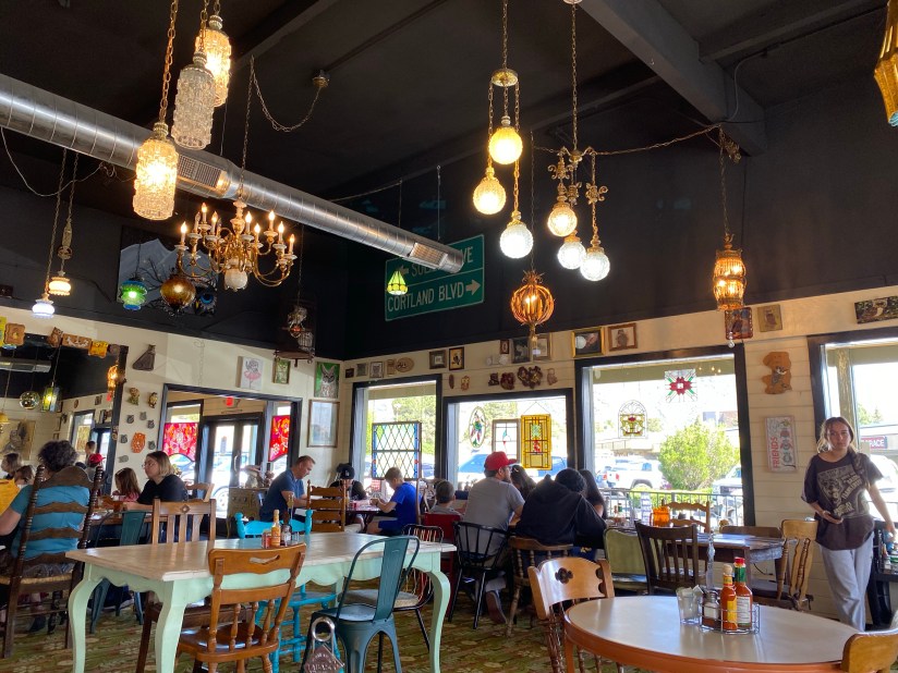The morning we departed for Scottsdale and home, we stopped in at The Toasted Owl eastside location on Cortland. Though popular, we were seated right away on a Friday morning. The menu had a selection of typical breakfast/brunch fare as well as some interesting Southwestern-inspired dishes. The storefront is decorated with an eclectic collection of owl-themed decor, along with unique chandeliers and pendant lamps. The place had a really cool, vintage vibe.