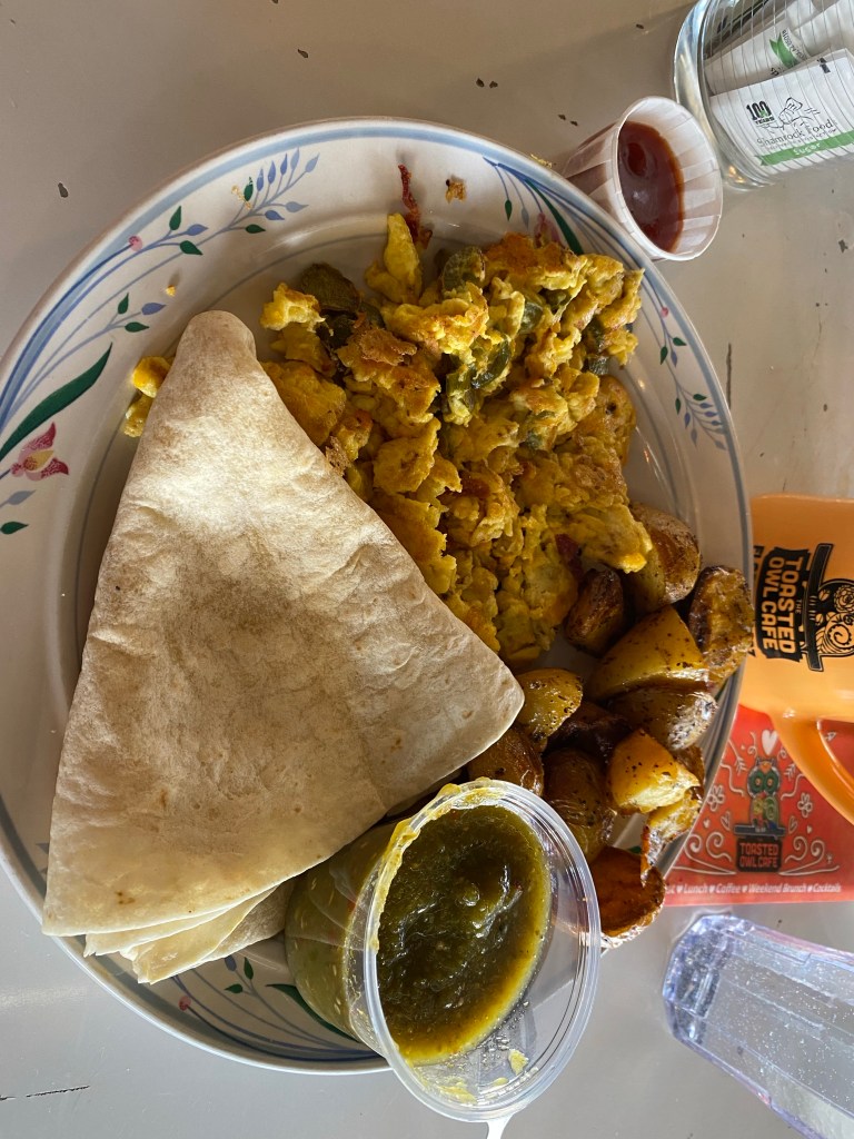 Once we were seated, it was a little bit before our drink orders were taken, but our server made it up by bringing us a very large cinnamon roll. We of course had coffee, and then the tough decision was what to order. I ended up ordering the Owlapeño Scramble, a breakfast scramble that had jalapeño and jalapeño poppers, and served with tortillas and a side of breakfast potatoes. The scramble was good, especially with the green salsa, but what really made the plate were the potatoes. Those were fantastic. All of the items in the restaurant are for sale, just inquire with your server about price. I purchased one of the owl mugs, which I’ll probably use in my classroom at summer’s end.