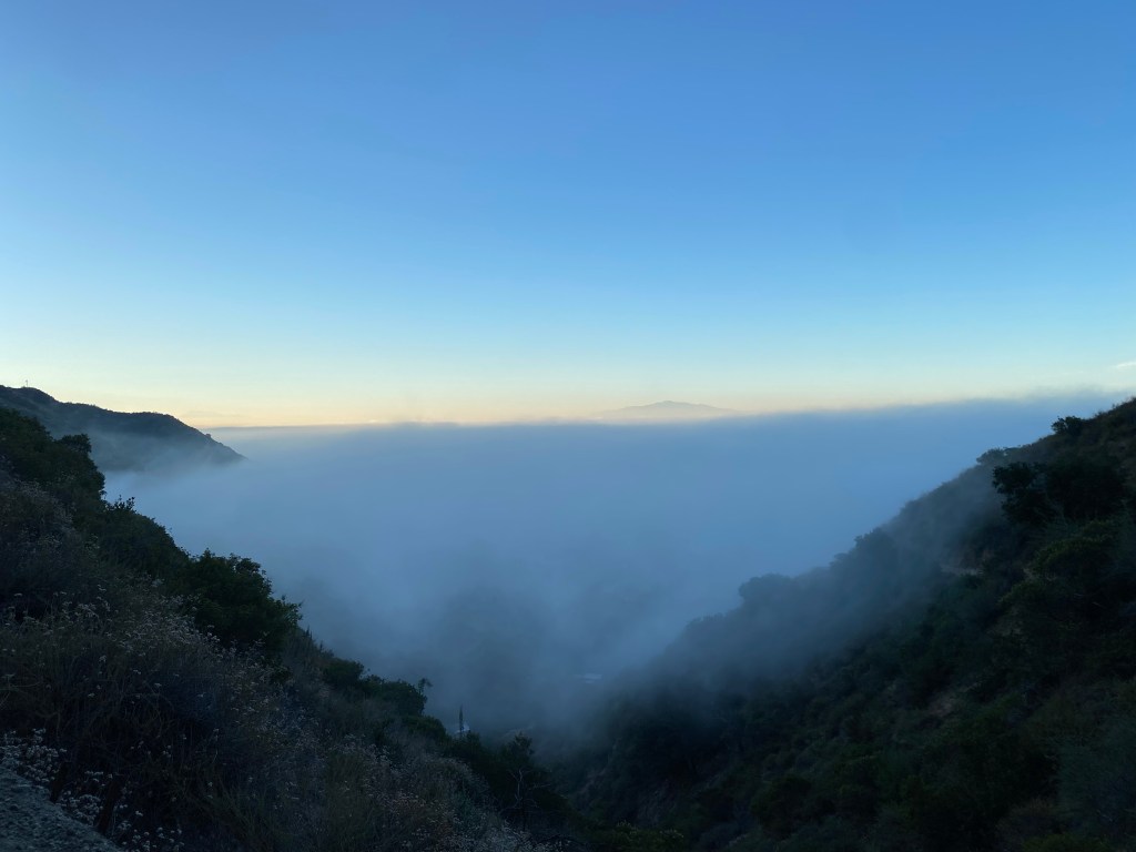 We began the trek to Mt. Wilson in much the same way we’ve started many other hikes on this trail: we met at the trailhead on Mira Monte Avenue in Sierra Madre, just past Mt. Wilson Trail Park early in the morning. Especially knowing that the day would be warm and that the hike would be 14.5 miles out-and-back, it was good to begin while the day was still cool. We could see the bright blue skies above the fog, and I was thankful that the morning was cool enough for a light sweater. Though I knew that I would be shedding it well before we arrived at Orchard Camp.