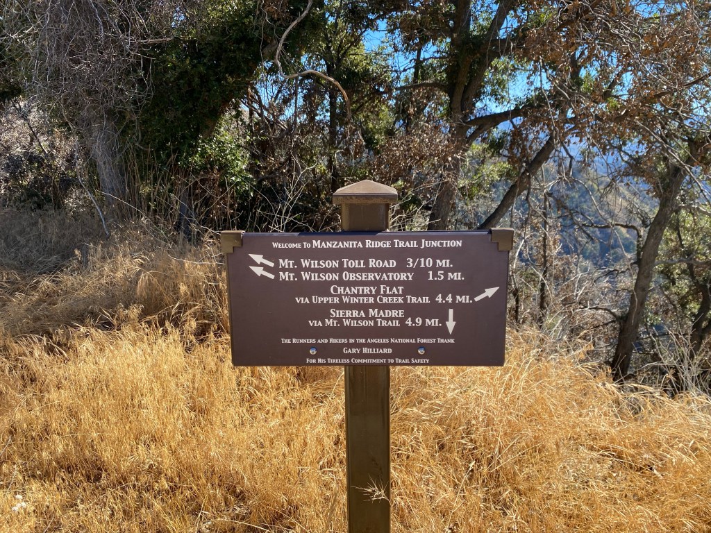 We took about a five minute break at the ridge. Here the Mt. Wilson Trail meets up with the Upper Winter Creek Trail to Chantry Flat. At time of writing however, the trail remains closed as a result of the 2020 Bobcat Fire and subsequent floods that damaged parts of the trail. It will hopefully open back up again next year. The views from Manzanita Ridge were really pretty looking toward Big Santa Anita Canyon, but even better was that we could see how close we were getting to Mt. Wilson. With some fresh encouragement and plenty of water, we headed up.