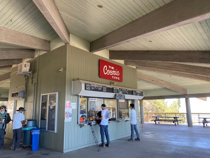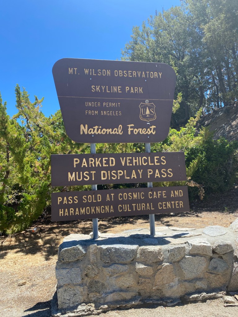 After visiting the museum, we went past the solar telescope, and found what we were looking for. We had asked the Forest Service guys where we could find the wood signs that many a hiker has posed with for social media. Following their direction to the vista point at Echo Rock, we came to the railed point that had views of the San Gabriels clear to Mt. Baldy and beyond to the east, and just behind us in the opposite direction, the observatory. We took many photos with the signs for our social medias then headed back to the cafe.