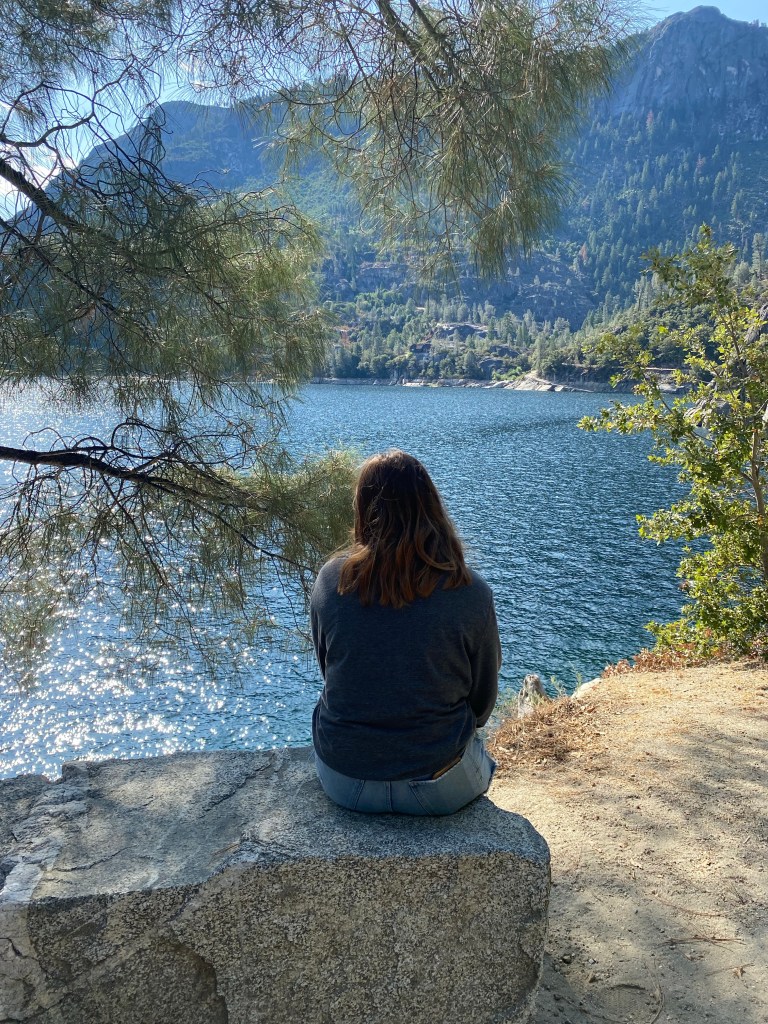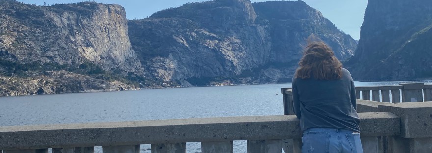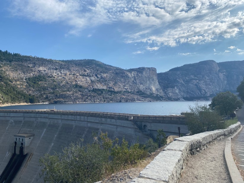 We traveled from Dimond O to O’Shaughnessy Dam the morning after our arrival at the campground. The total drive time was under 25 minutes, and most of that was because I observed the 25 mph speed limit once we entered the park. In addition to protecting wildlife and fellow visitors, the area is so pretty it deserves to be enjoyed rather than rushed through. Once we parked, we walked over to the dam and explored. From the dam, we could see Tueeulala and Wapama Falls. While enjoying the scenery, Sami and I talked about the ecology of the area, as well as the history of the dam and its construction, and the intersection of science and politics. After taking a few photos, we walked through the tunnel and onto the trail that lead us around the reservoir.