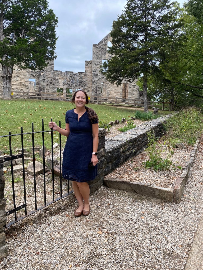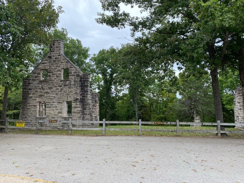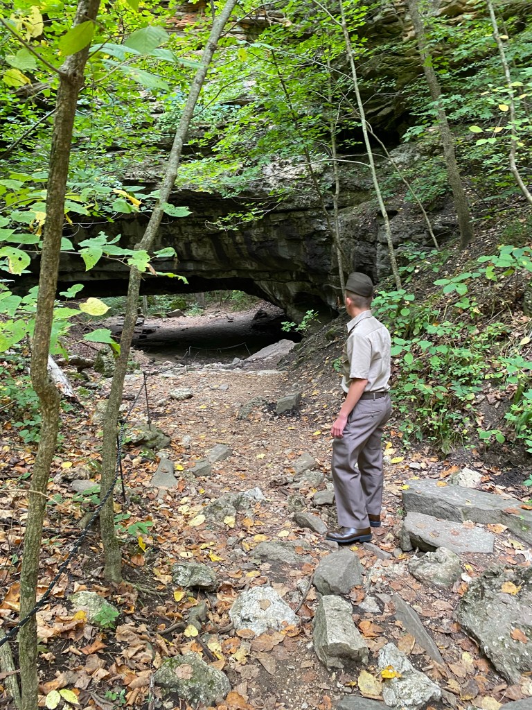 The Ozarks are a scenic highland region spanning across five states, with the most acreage located within southern Missouri and northern Arkansas, marked by beautiful hardwood forests and pristine lakes. The landscape was formed by volcanic eruptions that deposited igneous rocks such as granite, and over time, sedimentary formations such as as limestone, shale, and dolomite were deposited. As such, the region is also dominated by karst topography, a type of landform that is created when limestone and dolomite are chemically worn away by water. This resulted in the over 300 caves found within the Ozarks as well as many water-filled springs. The Ha Ha Tonka spring is a result of this development, and is the twelfth largest natural spring in Missouri. The natural bridge was formed as a result of this erosion. Natural Bridge is 70 feet wide with a span of 60 feet. There is a path that goes underneath the bridge. On our visit to Ha Ha Tonka State Park following Jacob’s graduation from basic training, we walked the trail under the bridge, and admired the cool geology, being careful to avoid the muddier spots as we were in our dress shoes.