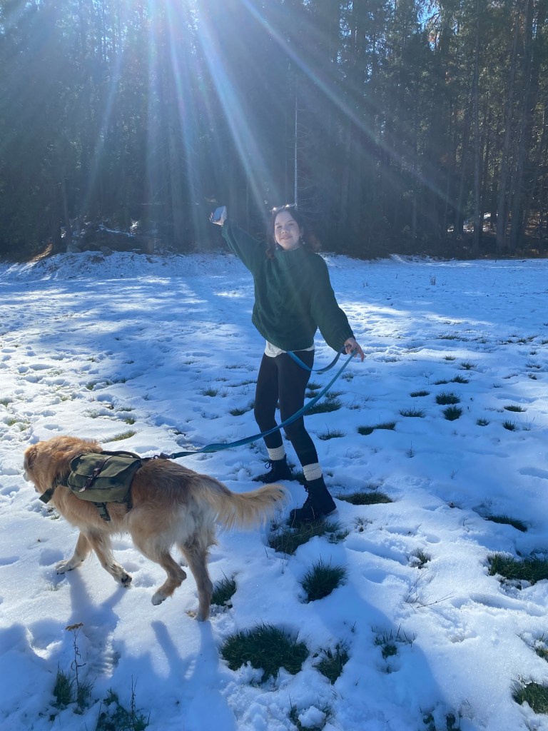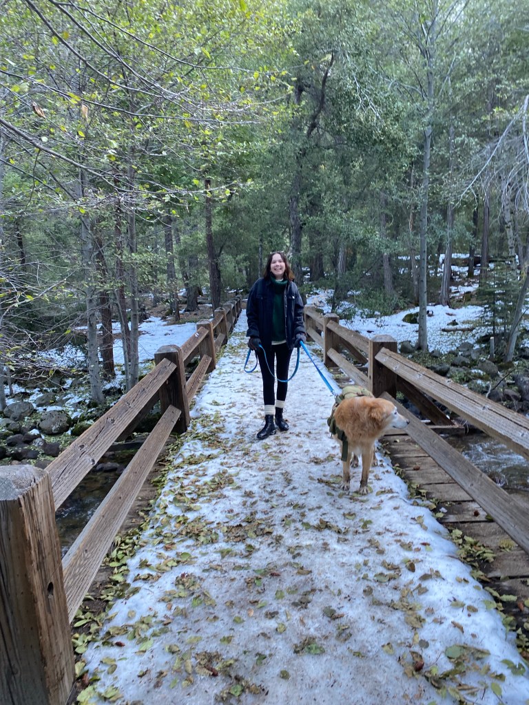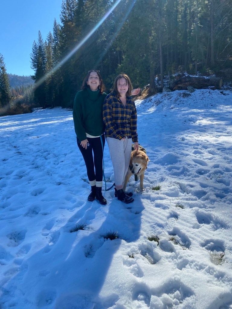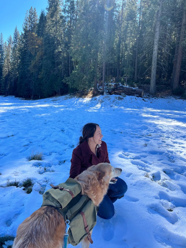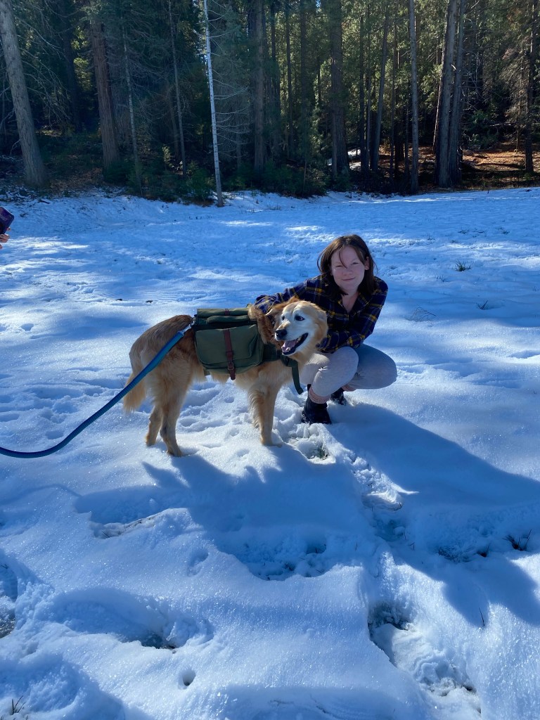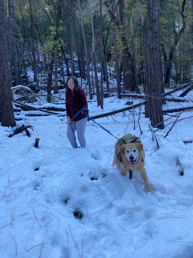 We hiked from the parking area near Upper Pines through the forest, following the footsteps left in the snow by other hikers. While the road would have been easier, the walk through the forest was prettier, and offered yet another opportunity for the girls to throw snowballs at each other and for Owen to lick more snow, which apparently he found delicious. There were not many people on this part of the valley, as it is furthest east from the Village, but there were enough to reassure Sami that it was safe to be on the trail- and to give Owen extra pets and attention. He was a happy dog hiking to Happy Isles indeed.