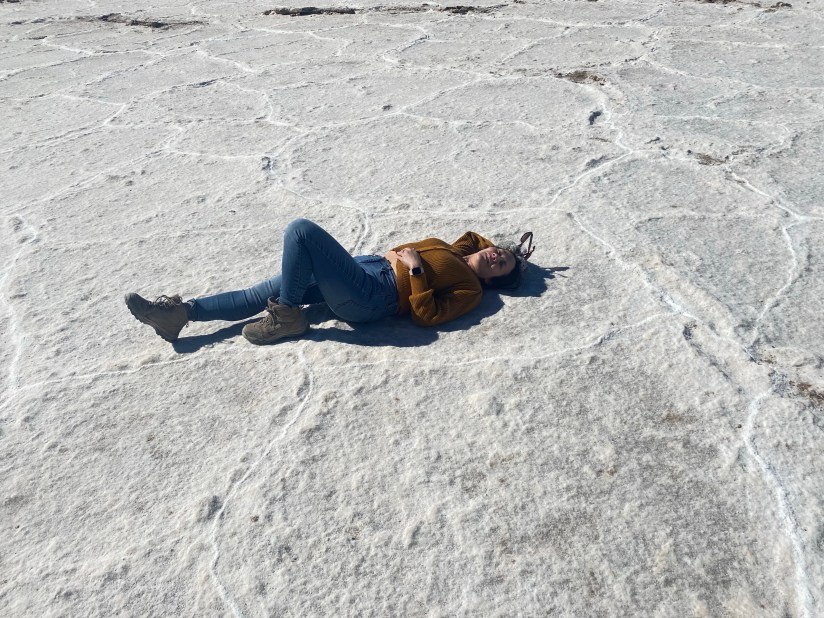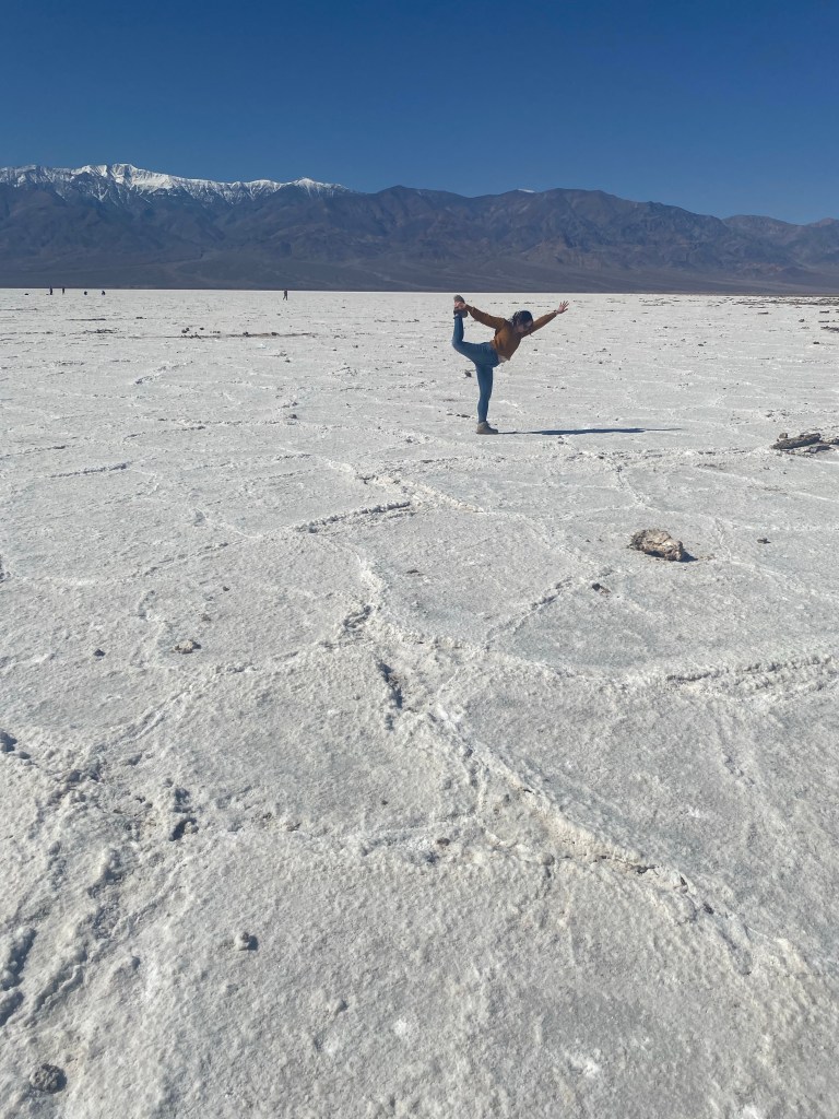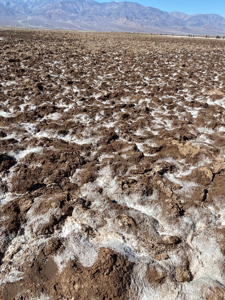 After parking the van, we joined the droves of visitors walking on the salt flats. The ground was slightly crunchy, but the hike was easy and flat. There is no real trail past the boardwalk, and once on the flats it was easy to spread out. We took many photos, making jokes about ‘hitting new lows.’ We also tried the salt. As the salt is composed mainly of table salt (sodium chloride), we figured the biggest issue would be germs from people walking on the flats. Yes it was salty, as one would expect. Please note that I am not recommending trying the salt. In addition to sodium chloride, gypsum, calcite, and borax also make up the salt on the flats.