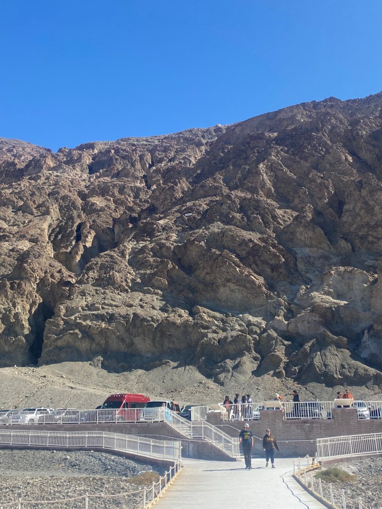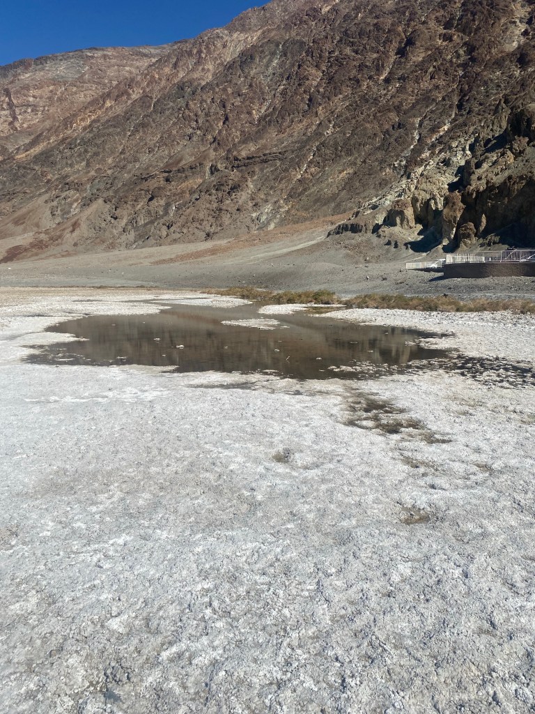 The flats appear to be unfavorable for life. There are not many plants that grow among the flats, and other than the hikers taking photos among the flats, there were not many other visible life forms. That said, there boardwalk near the parking lot that allows visitors to check out Badwater Pool. Despite its name, the pool is not ‘bad’ as in poisonous, it is merely salty. The source of the pool’s water is an ancient aquifer that flows up through the faultline at the base of the mountain. This pool is the natural habitat for Death Valley’s rare, native Badwater snail. These snails are endemic to the region and live only in the few springs at the edges of Death Valley’s salt flats. There is also pickleweed that grows around the pool.
