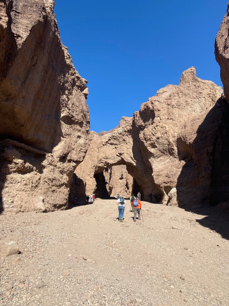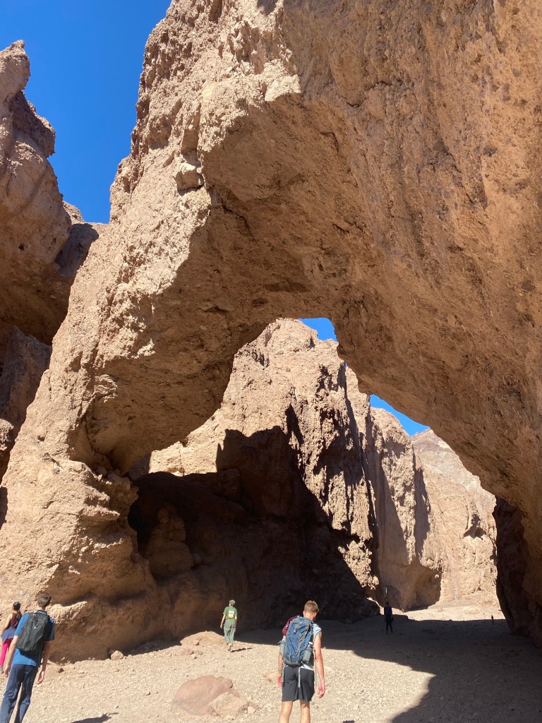 After visiting Badwater Basin the day prior, we stopped at Natural Bridge on the way back to the visitor center. After enjoying a sandwich buffet in the parking area, we trekked out about a half-mile and came to a 35-foot tall arched rock formation- the Natural Bridge. Unlike the arches of Arches National Park and others in Utah formed from smoother sandstone, Death Valley’s Natural Bridge was formed from the rocky alluvial deposits containing rock and gravel. Hikers can continue up the canyon and view more interesting geology, however we stopped at the arch and allowed the kids to climb for a bit. Climbing on the bridge itself is not permitted, but there were many other formations the kids were allowed to explore.