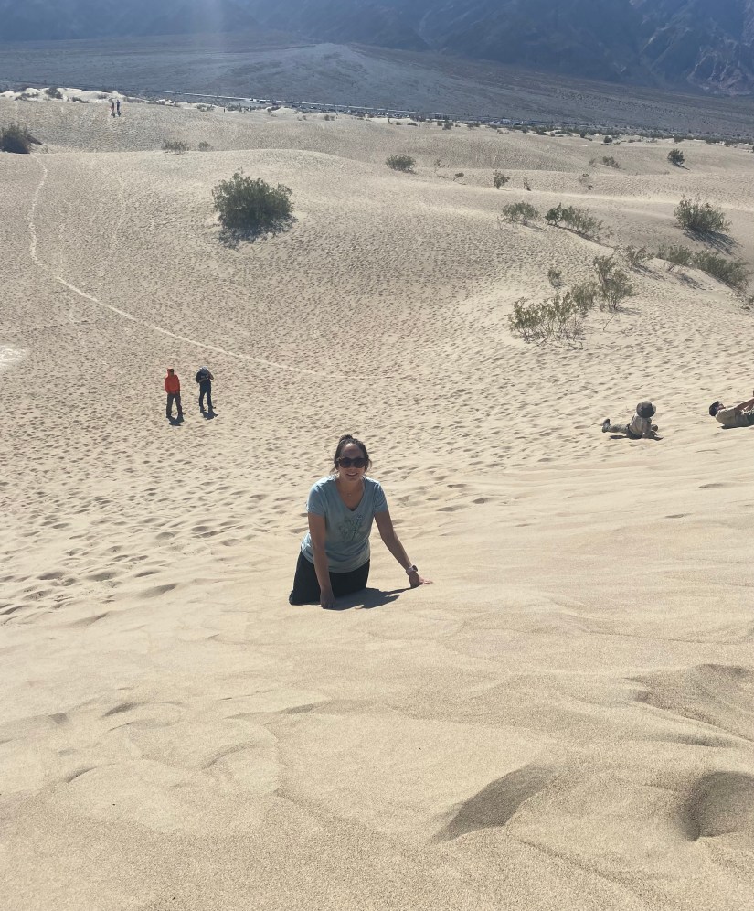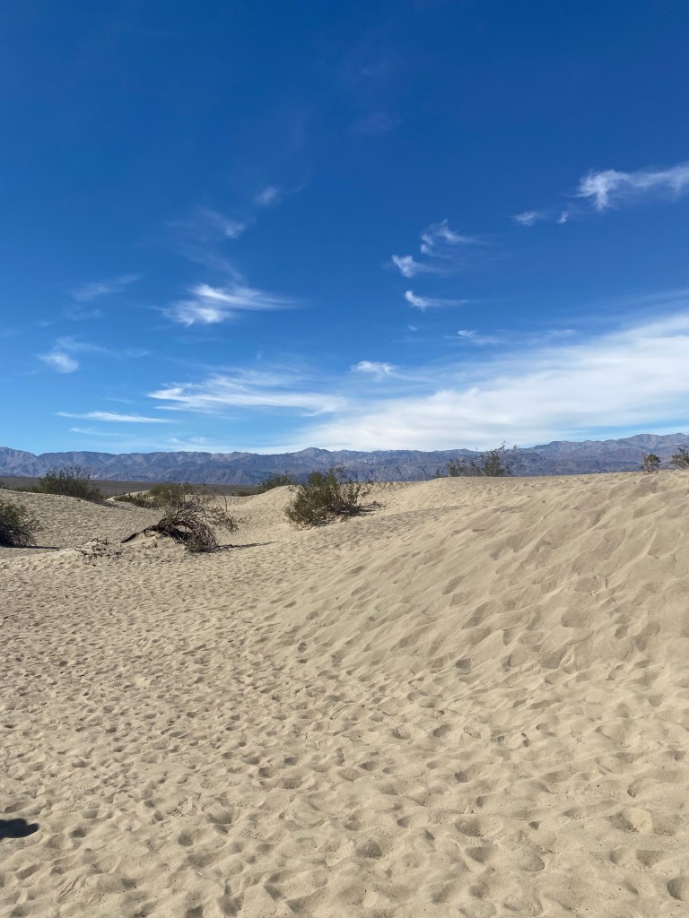 The two areas where recreation is permitted are Saline Valley and Mesquite Flat. We visited Mesquite Flat on the last day of our Death Valley adventure, and it was a blast. With dunes reaching a height of up to 100 feet, it is a paradise for those who enjoy sledding on sand. With a backdrop of the Panamint Mountains and the bright blue skies above, the area was a scenic spot for playing in the dunes.