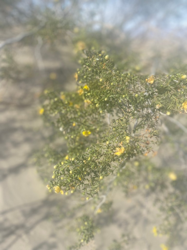 We scored a parking spot in the lot and headed out to the dunes. While on the trail, a couple who had finished sledding offered us their disc sled. We were thankful for this; we had intended to bring the sleds we had purchased in Utah years ago and had forgotten them while packing the van. After offering our thank-yous, we walked on, stopping to observe the flowering mesquite punctuating the landscape.
