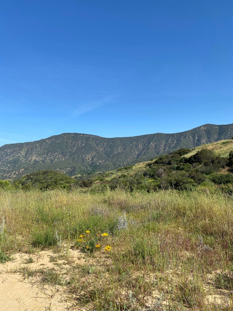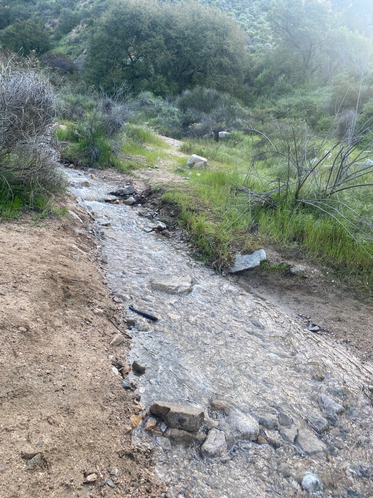 While not quite as dramatic as up north, the hikes we took the last few weekends were noticeably impacted by the wet winter storms. The Claremont Wilderness Loop this past Saturday had two small stream crossings that are not typically there: one before the junctions to the Burbank and Cobal Canyon Trails and one just past it, crossing Cobal Canyon. These were not very deep, and indeed, provided the relaxing sound of a bubbling stream on the trail before the incline. Along the trails, the wildflowers were in bloom and the trails were green with grasses.