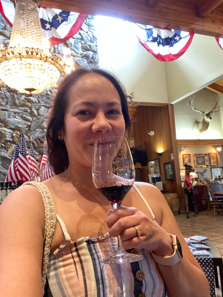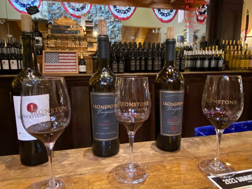 Our only full day in this section of California Gold Country was spent mostly in Murphys, an unincorporated village in Calaveras County with a rich history thanks to the Gold Rush as well as its vineyards. Our first activity combined the best of both of those worlds when we started our day at Ironstone Vineyards. We went for a wine tasting package that included a visit to the tasting room and two bottles of wine. This was a fun treat, and a nice way to belatedly celebrate our anniversary. I particularly enjoyed the Old Vine Zinfandels, varietals that are made from grapes from historic vines, including one that is over 111 years old at time of writing.