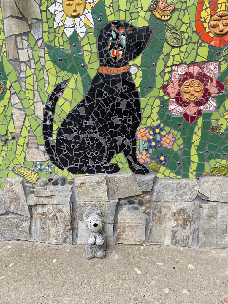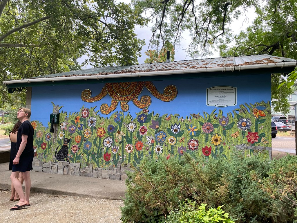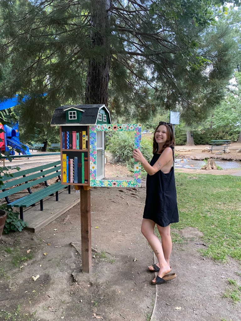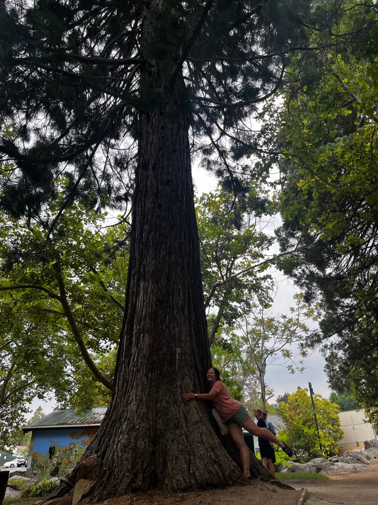 We walked on toward the bridge over Angels Creek and spent some time at Murphys Park. The park features a large play area, gazebo, and picnic areas, as well as a very pretty little free library. Angels Creek runs through the park and there are two young sequoia trees planted in the park. Of course, I had to hug one.