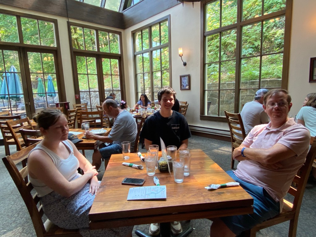 Unfortunately, this was not realized. The unusual heat of a northwestern heat event along with stifling humidity did not bode well for our cranky campers. We ended up turning around just past switchback 3 of 11. We did stop at the bridge again for more photos and to enjoy the cold spray from the falls. After cooling off, we walked over to the lodge. We decided to have lunch there as we were all still a bit hot and by this point, hungry. The food was rather mediocre, but it was really nice to get out of the heat.