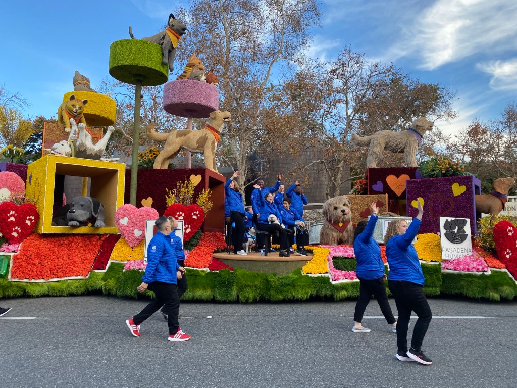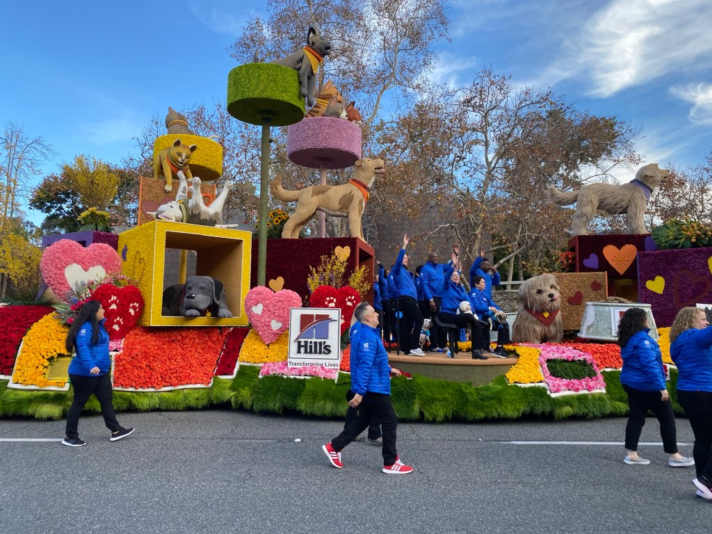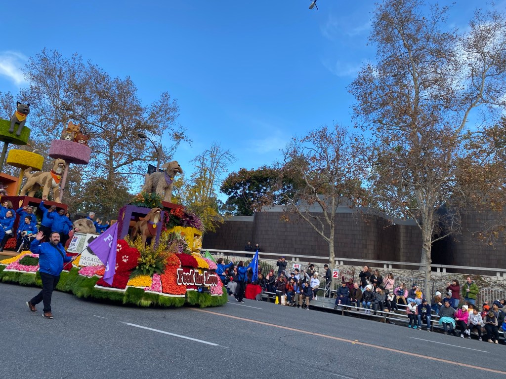 But perhaps my favorite float this year was the Pasadena Humane Society’s ‘Feed the Love,’ sponsored by Hill’s Pet Nutrition. According to the Pasadena Humane Society website, the 55-foot float pays tribute to the importance of pet adoption and healthy pet nutrition. The float itself is beautiful- with playful pups and kitties in colorful florals enjoying the comforts of a forever home surrounded with hearts.