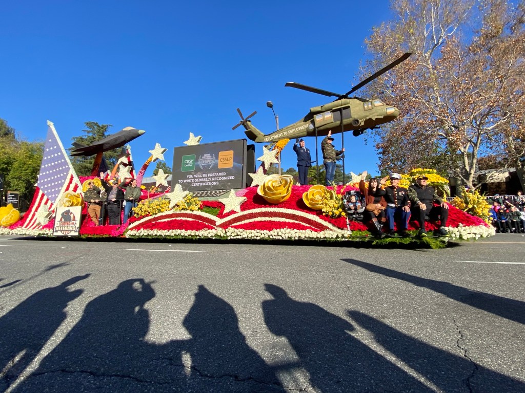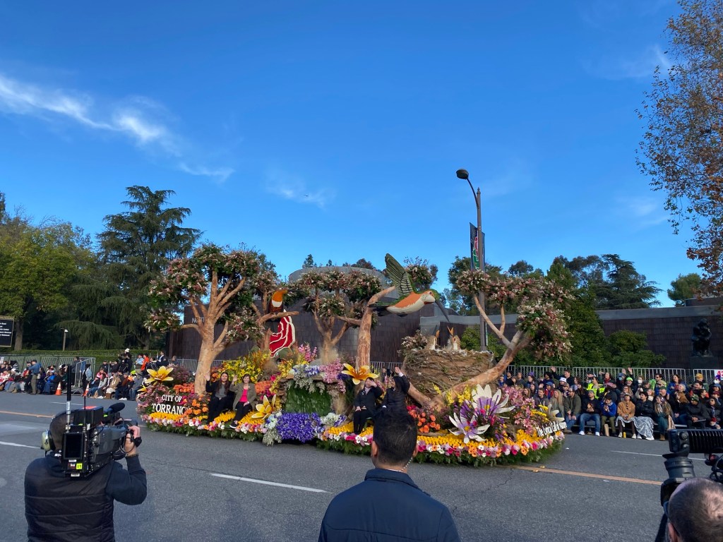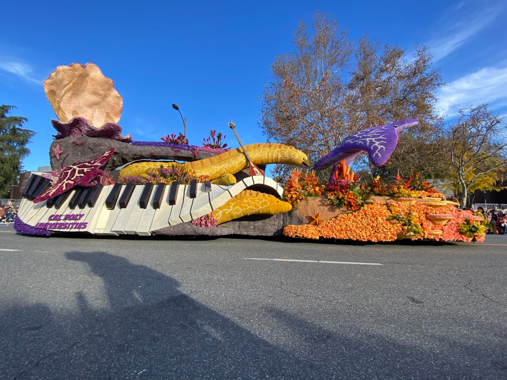 Some of my favorite floats this year included the City of Torrance, Newport Beach’s floral rendition of their holiday boat show, and One Legacy’s Dance of Life. As an alumna, I celebrated the Cal Poly Universities’ float, featuring a sea-themed floral motif. It was of course, creative and lovely, a celebration of the work of both Cal Poly Pomona and San Luis Obispo’s float clubs. I also appreciated the Coding for Veterans float which honors those in military service, which is very meaningful to me as an Army brat and a parent with a baby serving abroad.