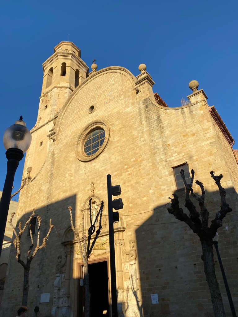 Following a brief rock-skipping competition with Nate, we walked back toward the town. There were people hanging out at the beach as well as in some of the restaurants in the series of alleys, however, it was rather quiet on a Wednesday mid-afternoon in winter. I would imagine that the place would be packed during the summer holidays. Still, the town itself was charming, and the walk was a good way to get in some steps and kill some time before dinner. We walked over to Iglesia de Santa MarĂa y San Nicolás, a Catholic Church in Calella with a long history. The parish itself dates back to the 1600s according to the church website, however the chapel building has seen some changes as a result of the collapse of the bell tower in 1747 and the civil war in 1936. The new building was reconstructed in 1940, and continues to hold mass and other services today.