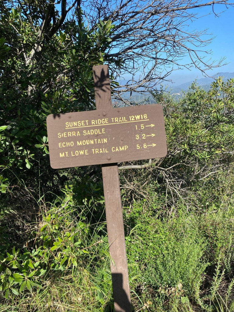 On Memorial Day, we set out to hike from Millard Campground to Dawn Mine. It appeared that much of the Pasadena area had the same thought. So after seeing that the campground parking lot was full, we drove back up and parked along Chaney Trail. After applying sunscreen and bug spray, we set off for the Sunset Ridge Trail. We followed the road back up to the gate by the small parking area at the junction of Chaney Trail and Mt. Lowe Road. We walked past the gate and continued on the road. After about a tenth of a mile, we saw the sign for the trail coming up from Millard Campground. We continued on the road in the direction of Echo Mountain. After about 0.4 mile, we came upon the sign for the Sunset Ridge Trail. There was also some nice signage talking about the history of the Mt. Lowe Scenic Railway and the significance of both Mt. Lowe Road and the trail we were hiking.