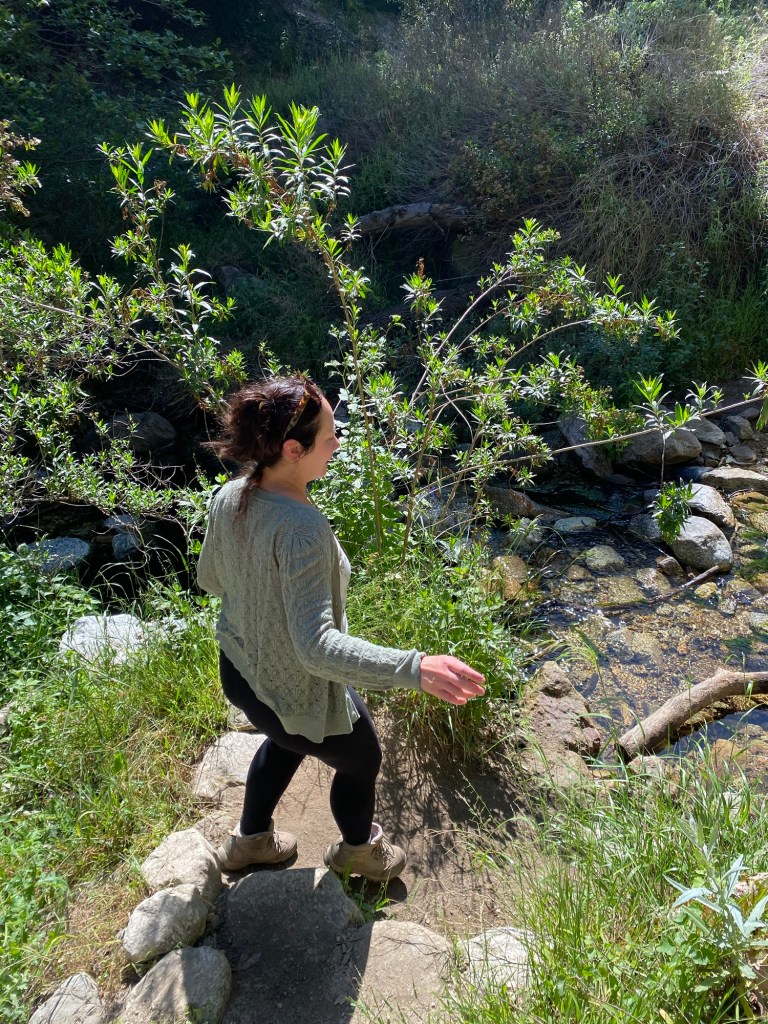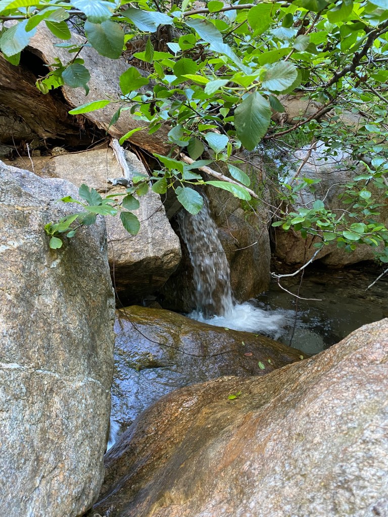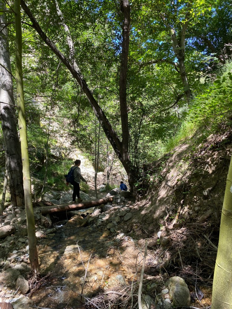 However, soon it was time to turn around. Our plan was to drive down to Riverside to pay tribute to Dad for Memorial Day, so we would have to hightail it back home to get changed. Rather than taking the loop trail, we headed back the way we came. In terms of distance and elevation, it was pretty similar to what we would have experienced had we done the lollipop, which is a route we’ve taken in the past. It felt faster heading out of the canyon, even with the rescue of a dropped water bottle in the stream and the heat of the day. All in all, it was a nice moderate hike through some pretty scenery.