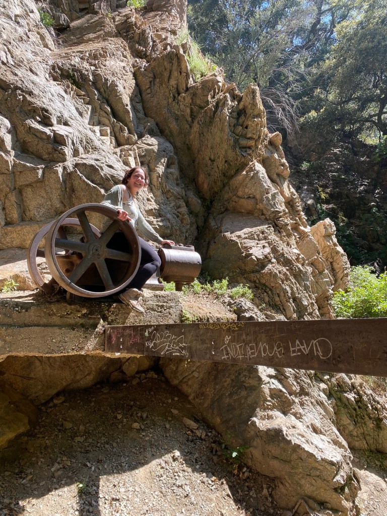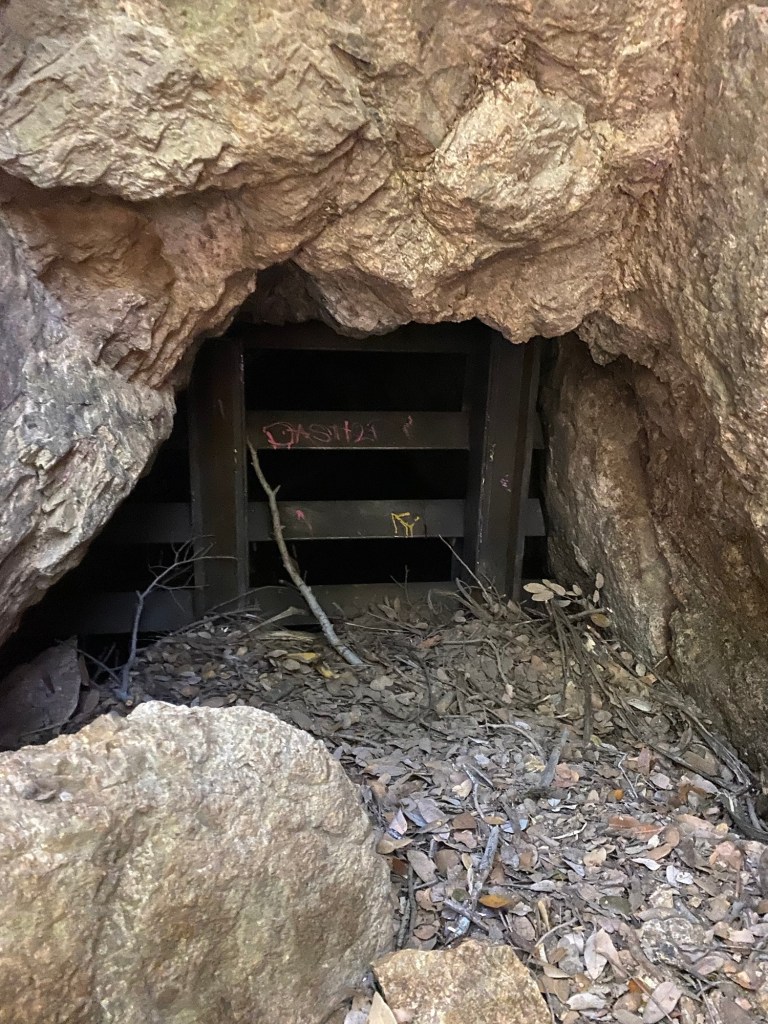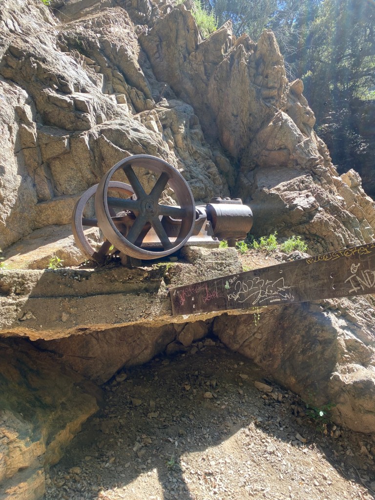 We continued the trail, and soon came to the remnants of the old water pump, our signal that we had arrived at Dawn Mine. According to friends of mine who grew up hiking the hills above Altadena, the mine used to be accessible, albeit dangerous, to explore. However, since about 2017, the entrance to the mine has been secured by a sturdy metal gate. This was due to vandalism, as well as the obvious safety issues an abandoned mine presents. Indeed, there was some water trickling from a rock close to the mine entrance, which could indicate that the lower part of the mine was flooded, as it is prone to do.