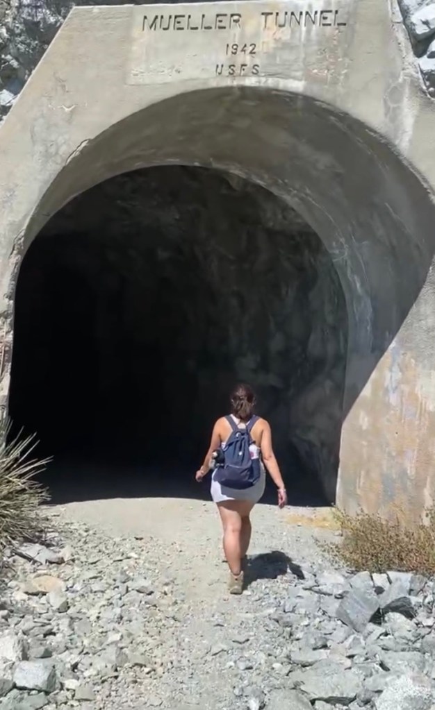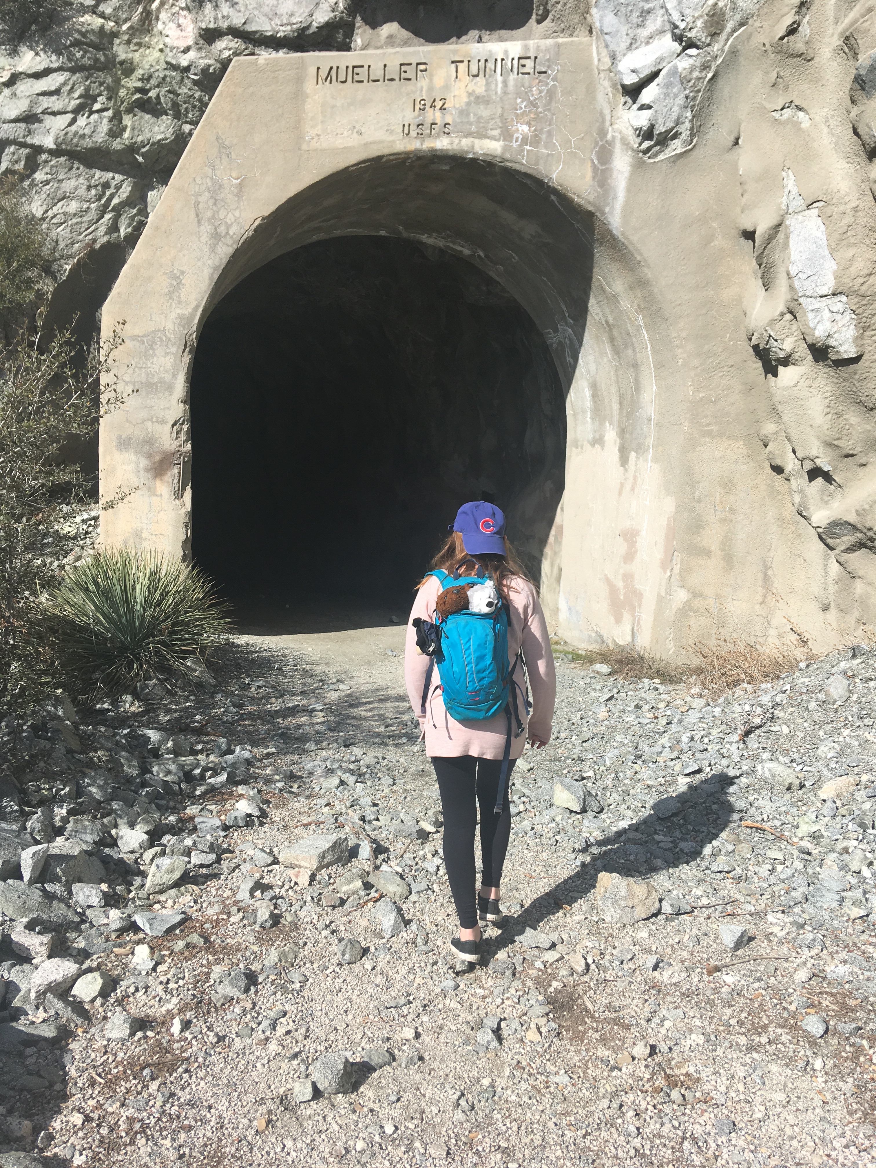 We stopped at the trailhead and read the signs commemorating the history of the Mt. Lowe Railroad during the ‘golden age of hiking.’ This was also a good opportunity for me to reapply some sunblock, and then we got on with our hike. We hiked west on the Mt. Lowe Motorway and passed through the Mueller Tunnel, an historic tunnel cut into the base of San Gabriel Peak. The U.S. Forest Service stamp is still visible, along with the year 1942.