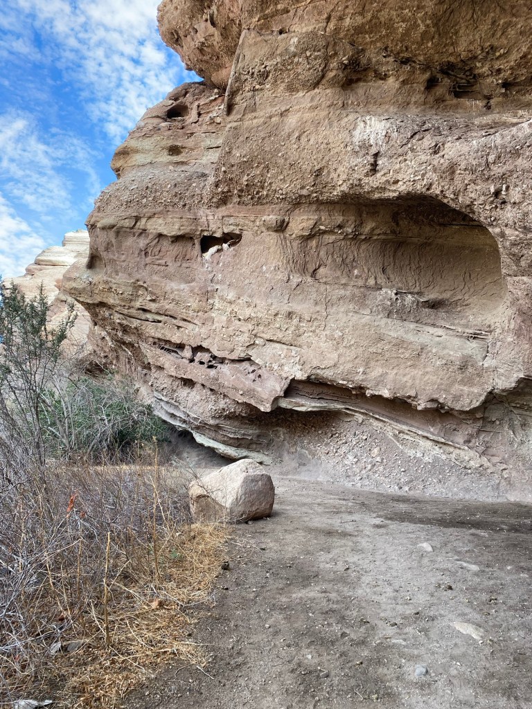 I walked through parking lot 1 outside the nature center and onto the road to the start of the Geology Trail. This trail, relatively flat, was a relaxed start to exploring the geology of Vasquez Rocks. After walking through a few small rock formations, the Geology Trail met up with the Pacific Crest Trail, the famed 2653-mile National Scenic Trail that starts at the Mexican border and runs through California, Oregon, and Washington up to the Canadian border. Vasquez Rocks Natural Area just happens to be right along the PCT, capturing just over two miles of this iconic trail. Not one to miss an opportunity for a new adventure, as advised by the docent, I decided to hike along the PCT to the tunnel that goes underneath SR-14.
